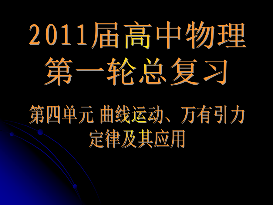 第四单元曲线运动、万有引力定律及其应用平抛物体的运动3、运动特征【例1】做平抛运动的物体,每秒的速度增量总是:A.大小相等,方向相同B.大小不等,方向不同C.大小相等,方向不同D.大小不等,方向相同如何用图形来表示呢?【例2】在海边高45m的悬崖上,海防部队进行实弹演习,一平射炮射击离悬崖水平距离为1200m,正以10m/s的速度迎面开来的靶舰,击中靶舰(g取10m/s2)试求:(1)炮弹发射的初速度(2)靶舰中弹时距离悬崖的水平距离平抛物体的运动的两个重要三角形解平抛运动类问题的一般思维:【例3】小球从