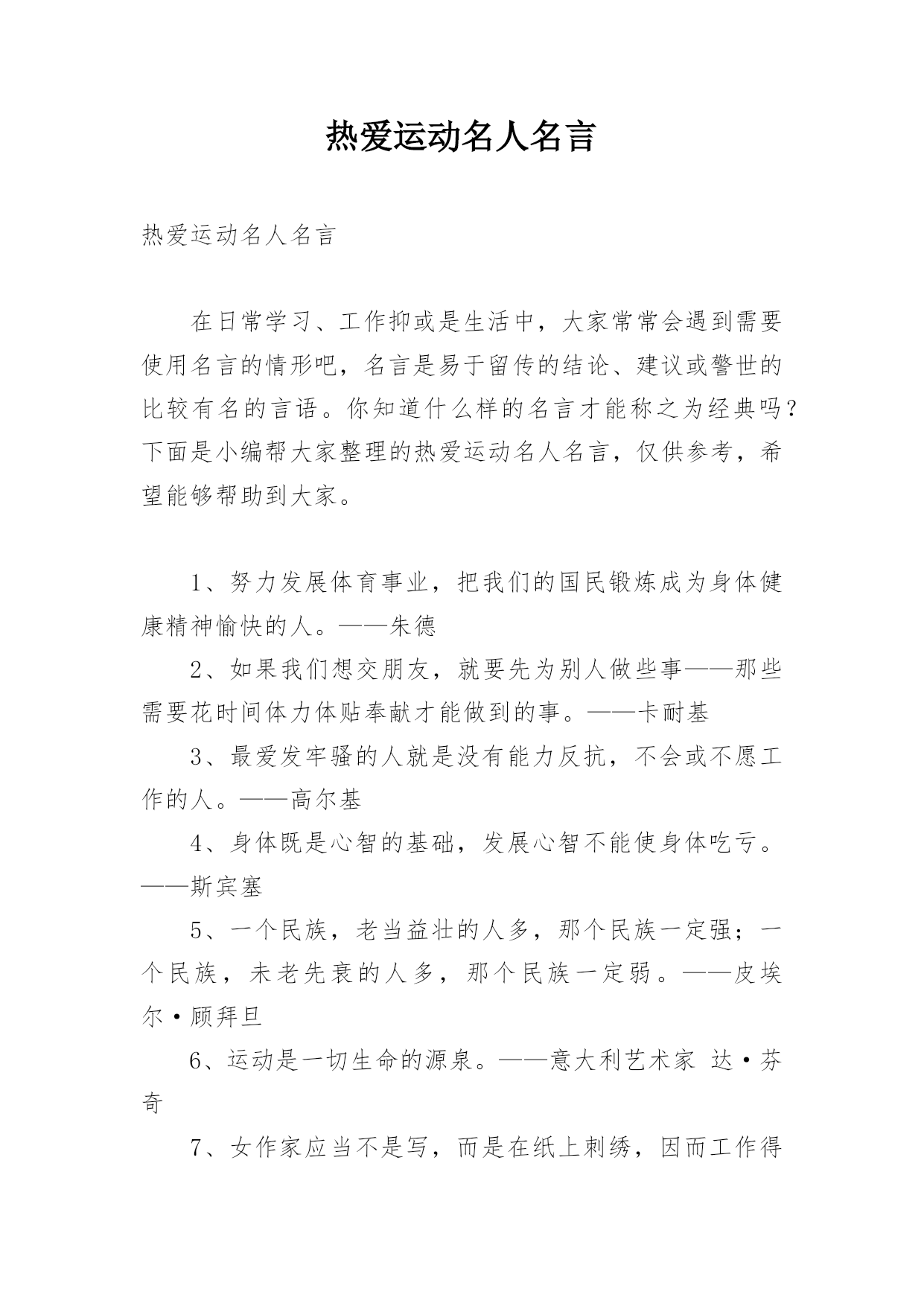 热爱运动名人名言热爱运动名人名言在日常学习、工作抑或是生活中,大家常常会遇到需要使用名言的情形吧,名言是易于留传的结论、建议或警世的比较有名的言语。你知道什么样的名言才能称之为经典吗?下面是小编帮大家整理的热爱运动名人名言,仅供参考,希望能够帮助到大家。1、努力发展体育事业,把我们的国民锻炼成为身体健康精神愉快的人。——朱德2、如果我们想交朋友,就要先为别人做些事——那些需要花时间体力体贴奉献才能做到的事。——卡耐基3、最爱发牢骚的人就是没有能力反抗,不会或不愿工作的人。——高尔基4、身体既是心智的基础,