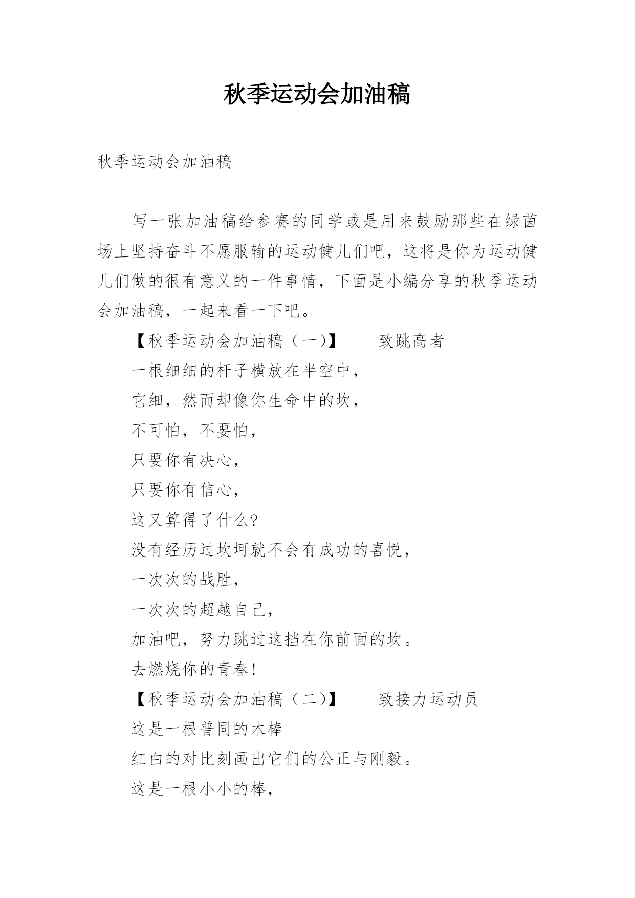 秋季运动会加油稿秋季运动会加油稿写一张加油稿给参赛的同学或是用来鼓励那些在绿茵场上坚持奋斗不愿服输的运动健儿们吧,这将是你为运动健儿们做的很有意义的一件事情,下面是小编分享的秋季运动会加油稿,一起来看一下吧。【秋季运动会加油稿(一)】致跳高者一根细细的杆子横放在半空中,它细,然而却像你生命中的坎,不可怕,不要怕,只要你有决心,只要你有信心,这又算得了什么?没有经历过坎坷就不会有成功的喜悦,一次次的战胜,一次次的超越自己,加油吧,努力跳过这挡在你前面的坎。去燃烧你的青春!【秋季运动会加油稿(二)】致接力运动