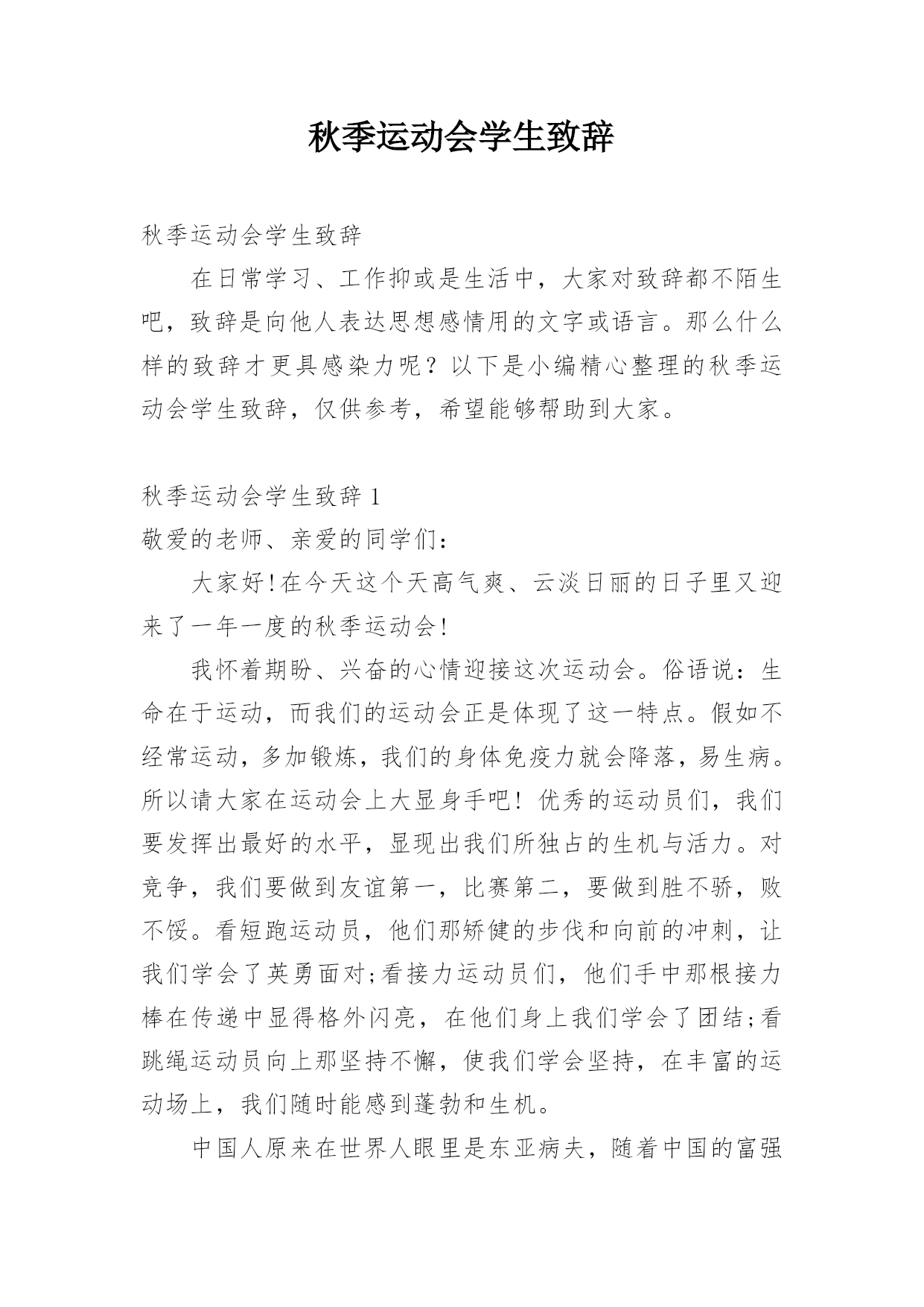 秋季运动会学生致辞秋季运动会学生致辞在日常学习、工作抑或是生活中,大家对致辞都不陌生吧,致辞是向他人表达思想感情用的文字或语言。那么什么样的致辞才更具感染力呢?以下是小编精心整理的秋季运动会学生致辞,仅供参考,希望能够帮助到大家。秋季运动会学生致辞1敬爱的老师、亲爱的同学们:大家好!在今天这个天高气爽、云淡日丽的日子里又迎来了一年一度的秋季运动会!我怀着期盼、兴奋的心情迎接这次运动会。俗语说:生命在于运动,而我们的运动会正是体现了这一特点。假如不经常运动,多加锻炼,我们的身体免疫力就会降落,易生病。所以请