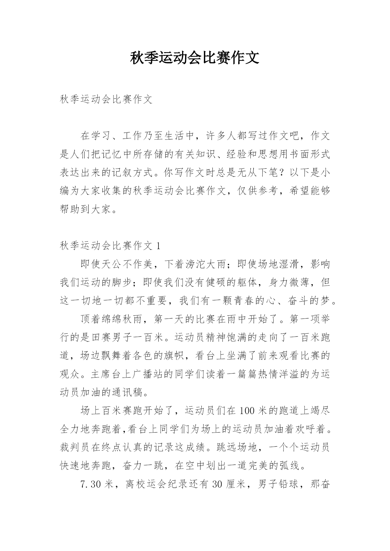 秋季运动会比赛作文秋季运动会比赛作文在学习、工作乃至生活中,许多人都写过作文吧,作文是人们把记忆中所存储的有关知识、经验和思想用书面形式表达出来的记叙方式。你写作文时总是无从下笔?以下是小编为大家收集的秋季运动会比赛作文,仅供参考,希望能够帮助到大家。秋季运动会比赛作文1即使天公不作美,下着滂沱大雨;即使场地湿滑,影响我们运动的脚步;即使我们没有健硕的躯体,身力微薄,但这一切地一切都不重要,我们有一颗青春的心、奋斗的梦。顶着绵绵秋雨,第一天的比赛在雨中开始了。第一项举行的是田赛男子一百米。运动员精神饱满的