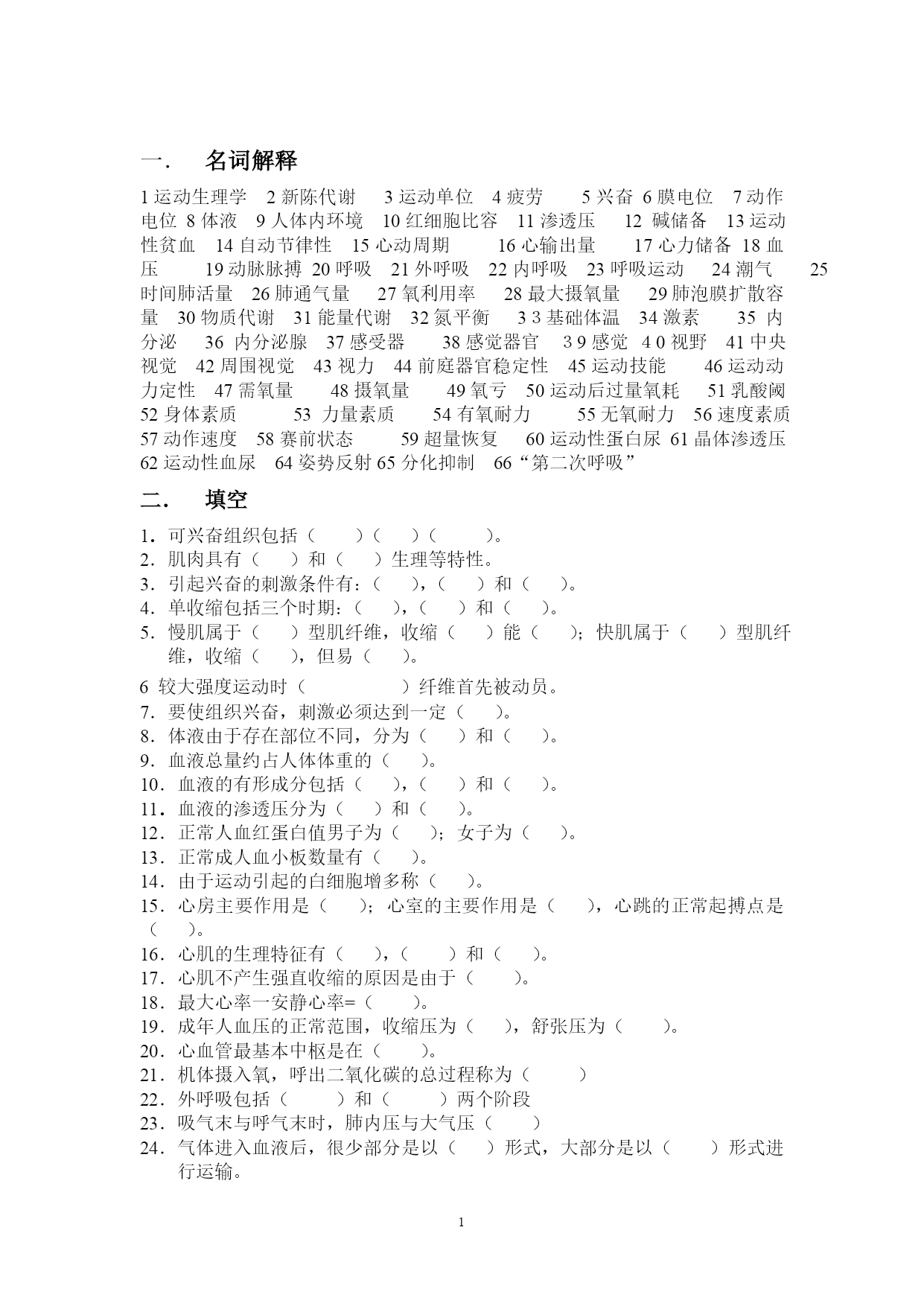 PAGEPAGE29名词解释1运动生理学2新陈代谢3运动单位4疲劳5兴奋6膜电位7动作电位8体液9人体内环境10红细胞比容11渗透压12碱储备13运动性贫血14自动节律性15心动周期16心输出量17心力储备18血压19动脉脉搏20呼吸21外呼吸22内呼吸23呼吸运动24潮气25时间肺活量26肺通气量27氧利用率28最大摄氧量29肺泡膜扩散容量30物质代谢31能量代谢32氮平衡33基础体温34激素35内分泌36内分泌腺37感受器38感觉器官39感觉40视野41中央视觉42周围视觉43视力44前庭