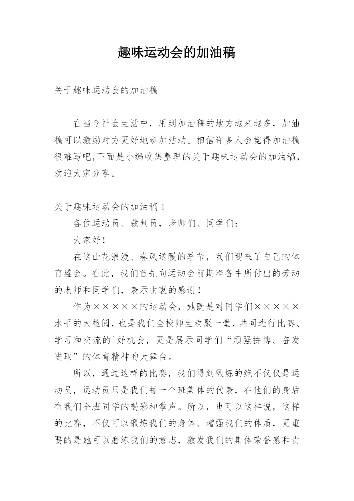 趣味运动会的加油稿关于趣味运动会的加油稿在当今社会生活中,用到加油稿的地方越来越多,加油稿可以激励对方更好地参加活动。相信许多人会觉得加油稿很难写吧,下面是小编收集整理的关于趣味运动会的加油稿,欢迎大家分享。关于趣味运动会的加油稿1各位运动员、裁判员,老师们、同学们:大家好!在这山花浪漫、春风送暖的季节,我们迎来了自己的体育盛会。在此,我们首先向运动会前期准备中所付出的劳动的老师和同学们,表示由衷的感谢!作为×××××的运动会,她既是对同学们×××××水平的大检阅,也是我们全校师生欢聚一堂,共同进行比赛、