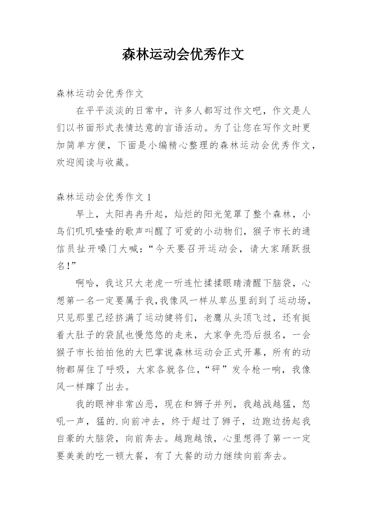 森林运动会优秀作文森林运动会优秀作文在平平淡淡的日常中,许多人都写过作文吧,作文是人们以书面形式表情达意的言语活动。为了让您在写作文时更加简单方便,下面是小编精心整理的森林运动会优秀作文,欢迎阅读与收藏。森林运动会优秀作文1早上,太阳冉冉升起,灿烂的阳光笼罩了整个森林,小鸟们叽叽喳喳的歌声叫醒了可爱的小动物们,猴子市长的通信员扯开嗓门大喊:“今天要召开运动会,请大家踊跃报名!”啊哈,我这只大老虎一听连忙揉揉眼睛清醒下脑袋,心想第一名一定要属于我,我像风一样从草丛里刮到了运动场,只见那里己经挤满了运动健将们