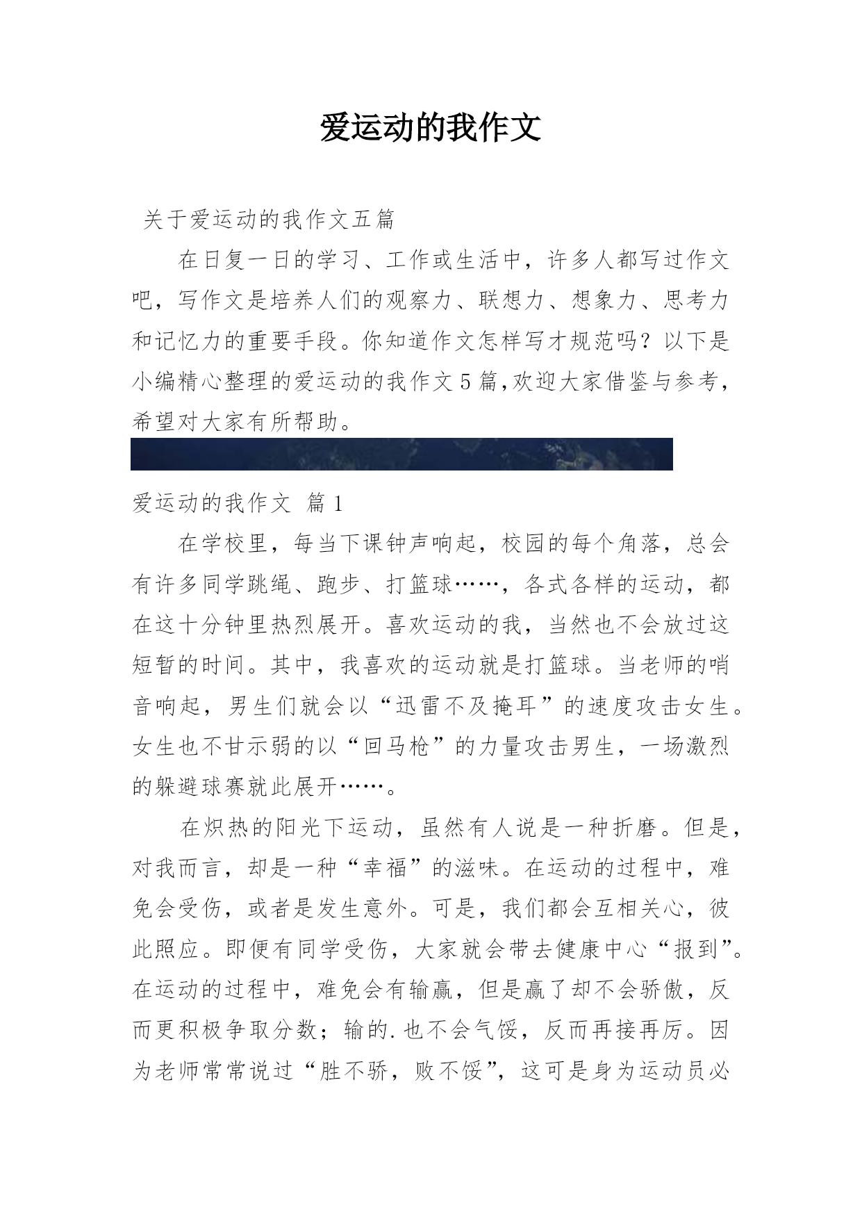 爱运动的我作文关于爱运动的我作文五篇在日复一日的学习、工作或生活中,许多人都写过作文吧,写作文是培养人们的观察力、联想力、想象力、思考力和记忆力的重要手段。你知道作文怎样写才规范吗?以下是小编精心整理的爱运动的我作文5篇,欢迎大家借鉴与参考,希望对大家有所帮助。爱运动的我作文篇1在学校里,每当下课钟声响起,校园的每个角落,总会有许多同学跳绳、跑步、打篮球……,各式各样的运动,都在这十分钟里热烈展开。喜欢运动的我,当然也不会放过这短暂的时间。其中,我喜欢的运动就是打篮球。当老师的哨音响起,男生们就会以“迅雷