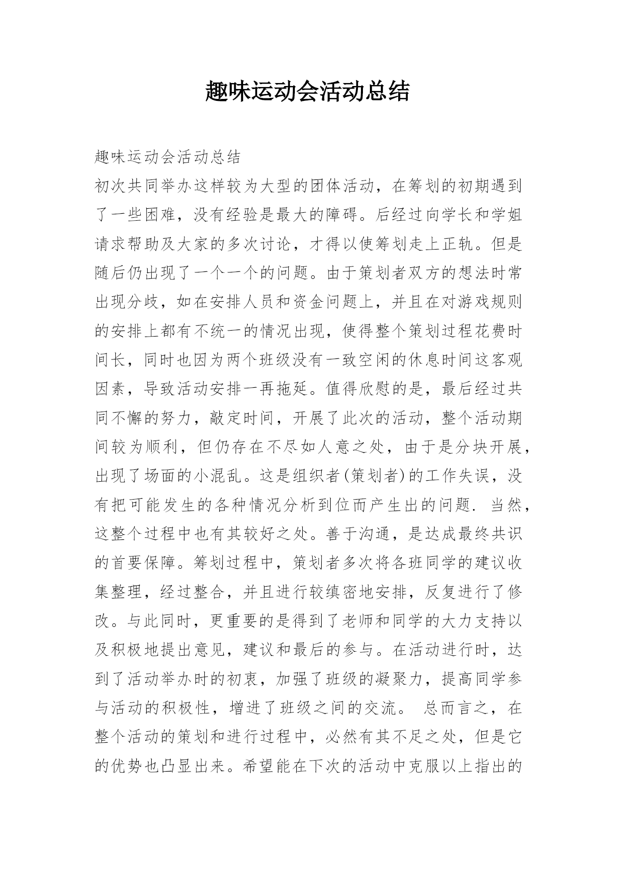 趣味运动会活动总结趣味运动会活动总结初次共同举办这样较为大型的团体活动,在筹划的初期遇到了一些困难,没有经验是最大的障碍。后经过向学长和学姐请求帮助及大家的多次讨论,才得以使筹划走上正轨。但是随后仍出现了一个一个的问题。由于策划者双方的想法时常出现分歧,如在安排人员和资金问题上,并且在对游戏规则的安排上都有不统一的情况出现,使得整个策划过程花费时间长,同时也因为两个班级没有一致空闲的休息时间这客观因素,导致活动安排一再拖延。值得欣慰的是,最后经过共同不懈的努力,敲定时间,开展了此次的活动,整个活动期间较为