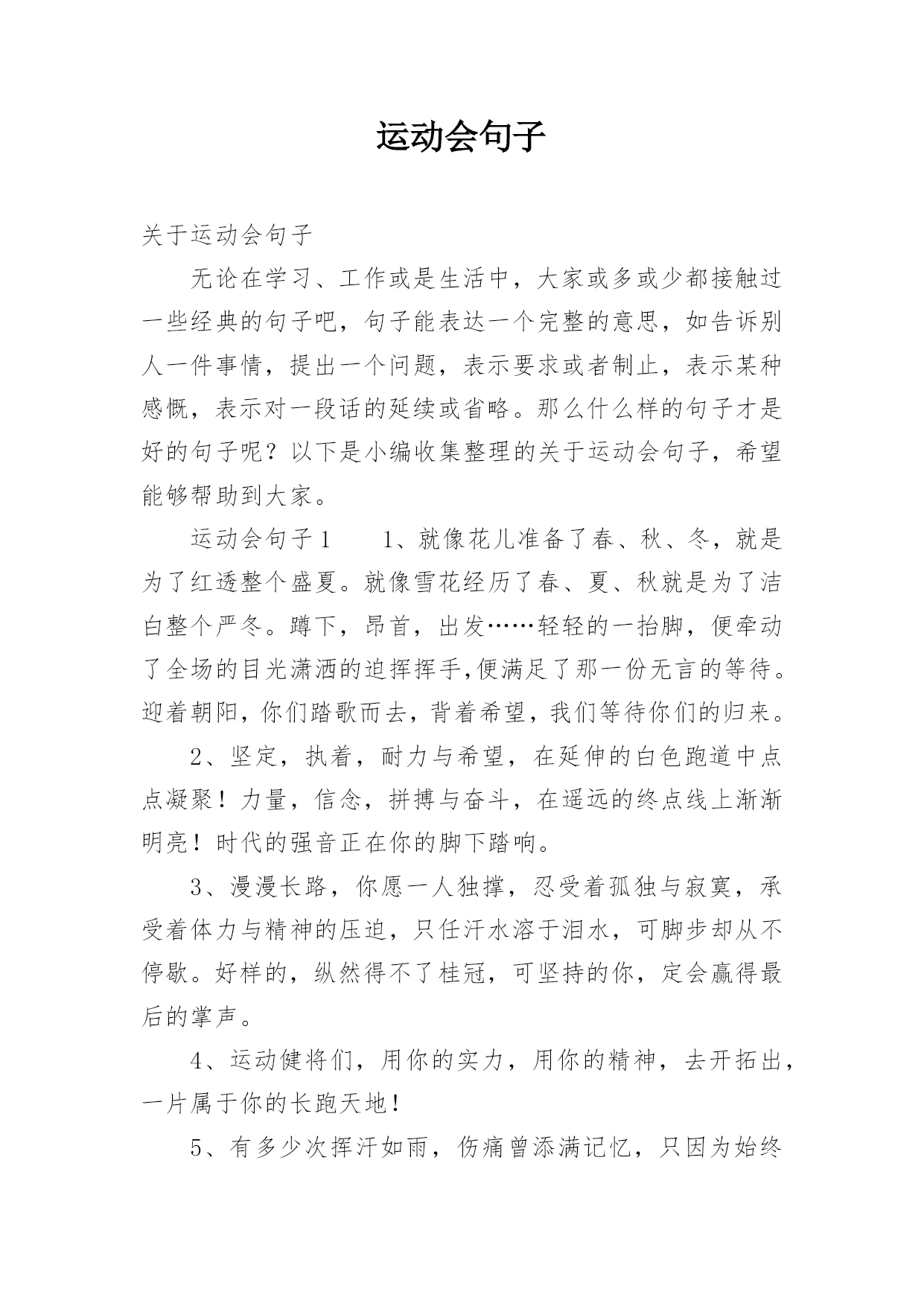 运动会句子关于运动会句子无论在学习、工作或是生活中,大家或多或少都接触过一些经典的句子吧,句子能表达一个完整的意思,如告诉别人一件事情,提出一个问题,表示要求或者制止,表示某种感慨,表示对一段话的延续或省略。那么什么样的句子才是好的句子呢?以下是小编收集整理的关于运动会句子,希望能够帮助到大家。运动会句子11、就像花儿准备了春、秋、冬,就是为了红透整个盛夏。就像雪花经历了春、夏、秋就是为了洁白整个严冬。蹲下,昂首,出发……轻轻的一抬脚,便牵动了全场的目光潇洒的迫挥挥手,便满足了那一份无言的等待。迎着朝阳,