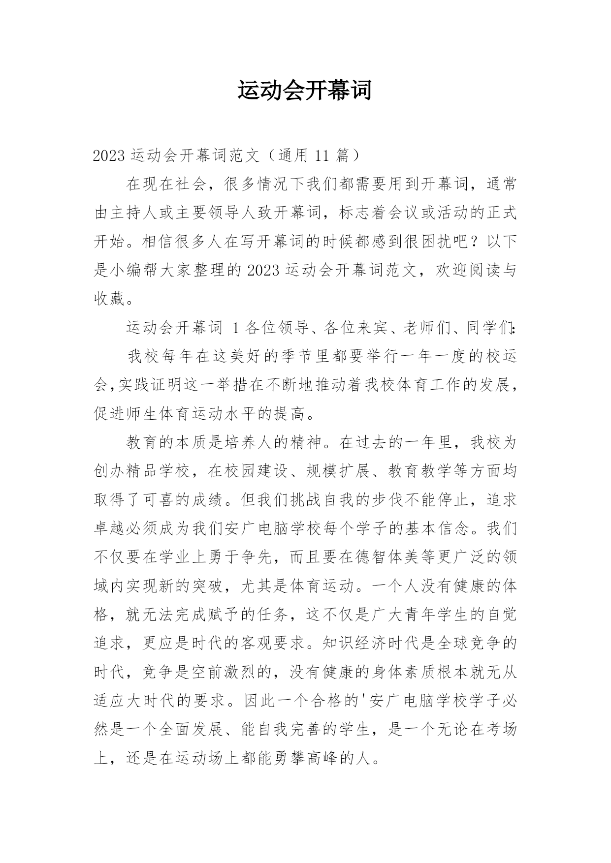 运动会开幕词2023运动会开幕词范文(通用11篇)在现在社会,很多情况下我们都需要用到开幕词,通常由主持人或主要领导人致开幕词,标志着会议或活动的正式开始。相信很多人在写开幕词的时候都感到很困扰吧?以下是小编帮大家整理的2023运动会开幕词范文,欢迎阅读与收藏。运动会开幕词1各位领导、各位来宾、老师们、同学们:我校每年在这美好的季节里都要举行一年一度的校运会,实践证明这一举措在不断地推动着我校体育工作的发展,促进师生体育运动水平的提高。教育的本质是培养人的精神。在过去的一年里,我校为创办精品学校,在校园建