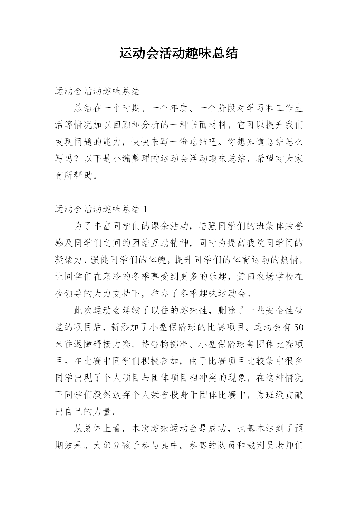 运动会活动趣味总结运动会活动趣味总结总结在一个时期、一个年度、一个阶段对学习和工作生活等情况加以回顾和分析的一种书面材料,它可以提升我们发现问题的能力,快快来写一份总结吧。你想知道总结怎么写吗?以下是小编整理的运动会活动趣味总结,希望对大家有所帮助。运动会活动趣味总结1为了丰富同学们的课余活动,增强同学们的班集体荣誉感及同学们之间的团结互助精神,同时为提高我院同学间的凝聚力,强健同学们的体魄,提升同学们的体育运动的热情,让同学们在寒冷的冬季享受到更多的乐趣,黄田农场学校在校领导的大力支持下,举办了冬季趣味