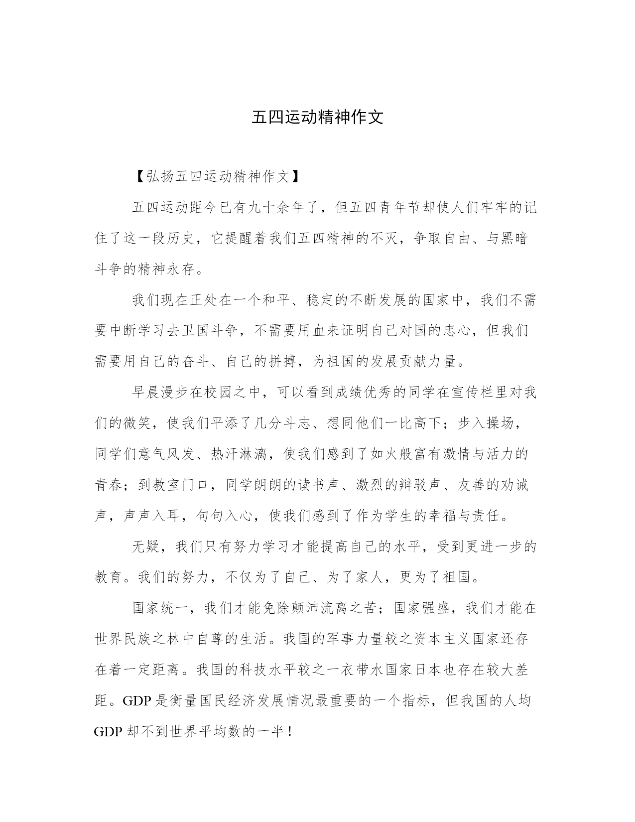五四运动精神作文【弘扬五四运动精神作文】五四运动距今已有九十余年了,但五四青年节却使人们牢牢的记住了这一段历史,它提醒着我们五四精神的不灭,争取自由、与黑暗斗争的精神永存。我们现在正处在一个和平、稳定的不断发展的国家中,我们不需要中断学习去卫国斗争,不需要用血来证明自己对国的忠心,但我们需要用自己的奋斗、自己的拼搏,为祖国的发展贡献力量。早晨漫步在校园之中,可以看到成绩优秀的同学在宣传栏里对我们的微笑,使我们平添了几分斗志、想同他们一比高下;步入操场,同学们意气风发、热汗淋漓,使我们感到了如火般富有激情与