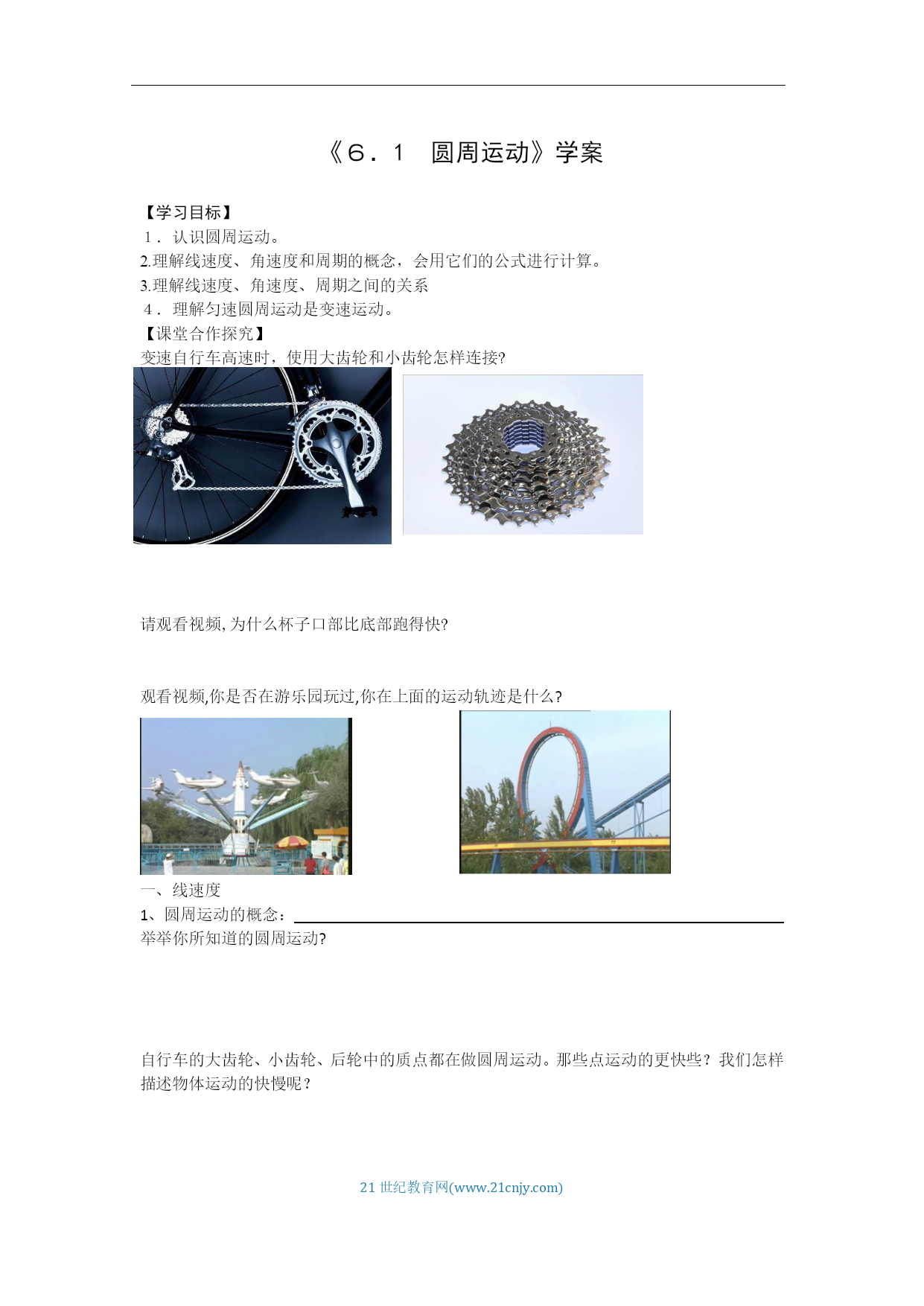 HYPERLINK"http://www.21cnjy.com/"21世纪教育网(www.21cnjy.com)《6.1圆周运动》学案【学习目标】1.认识圆周运动。2.理解线速度、角速度和周期的概念,会用它们的公式进行计算。3.理解线速度、角速度、周期之间的关系4.理解匀速圆周运动是变速运动。【课堂合作探究】变速自行车高速时,使用大齿轮和小齿轮怎样连接?请观看视频,为什么杯子口部比底部跑得快?观看视频,你是否在游乐园玩过,你在上面的运动轨迹是什么?一、线速度1、圆周运动的概念:举举你所知道的圆周运动