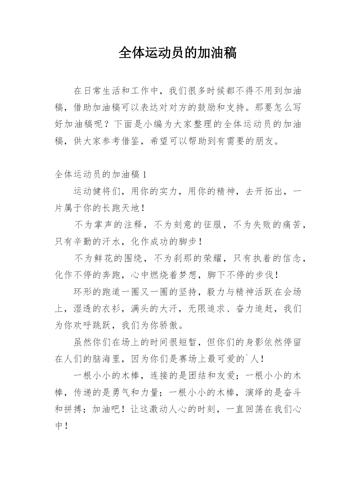 全体运动员的加油稿在日常生活和工作中,我们很多时候都不得不用到加油稿,借助加油稿可以表达对对方的鼓励和支持。那要怎么写好加油稿呢?下面是小编为大家整理的全体运动员的加油稿,供大家参考借鉴,希望可以帮助到有需要的朋友。全体运动员的加油稿1运动健将们,用你的实力,用你的精神,去开拓出,一片属于你的长跑天地!不为掌声的注释,不为刻意的征服,不为失败的痛苦,只有辛勤的汗水,化作成功的脚步!不为鲜花的围绕,不为刹那的荣耀,只有执着的信念,化作不停的奔跑,心中燃烧着梦想,脚下不停的步伐!环形的跑道一圈又一圈的坚持,毅