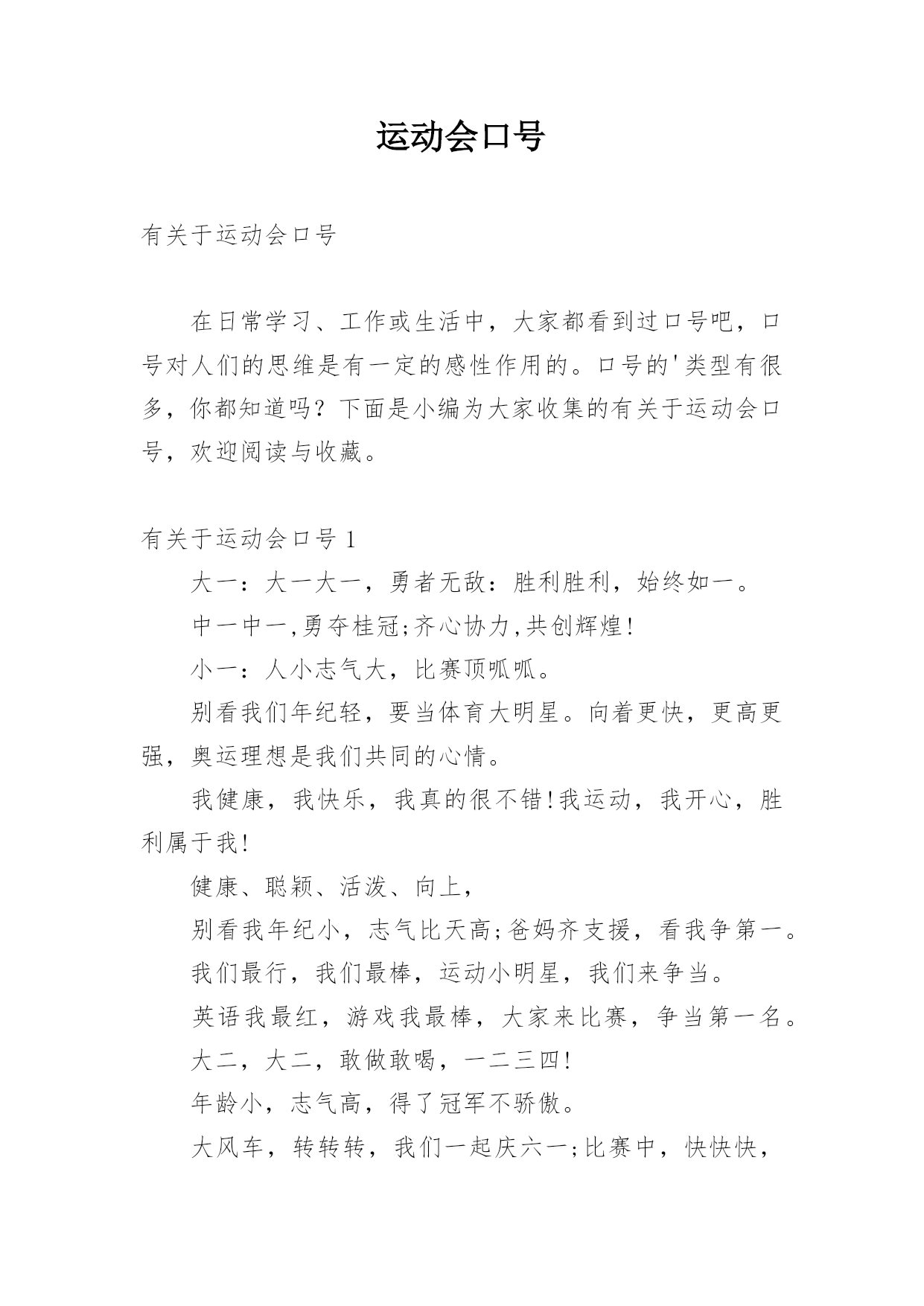 运动会口号有关于运动会口号在日常学习、工作或生活中,大家都看到过口号吧,口号对人们的思维是有一定的感性作用的。口号的'类型有很多,你都知道吗?下面是小编为大家收集的有关于运动会口号,欢迎阅读与收藏。有关于运动会口号1大一:大一大一,勇者无敌:胜利胜利,始终如一。中一中一,勇夺桂冠;齐心协力,共创辉煌!小一:人小志气大,比赛顶呱呱。别看我们年纪轻,要当体育大明星。向着更快,更高更强,奥运理想是我们共同的心情。我健康,我快乐,我真的很不错!我运动,我开心,胜利属于我!健康、聪颖、活泼、向上,别看我年纪小,志气