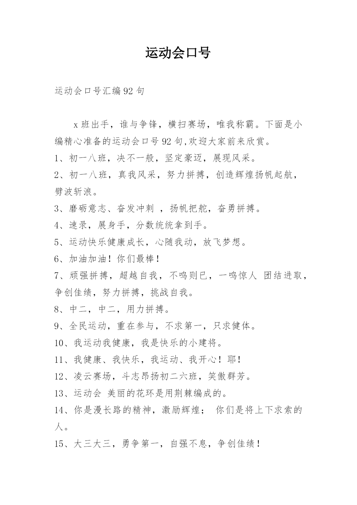 运动会口号运动会口号汇编92句x班出手,谁与争锋,横扫赛场,唯我称霸。下面是小编精心准备的运动会口号92句,欢迎大家前来欣赏。1、初一八班,决不一般,坚定豪迈,展现风采。2、初一八班,真我风采,努力拼搏,创造辉煌扬帆起航,劈波斩浪。3、磨砺意志、奋发冲刺,扬帆把舵,奋勇拼搏。4、速录,展身手,分数统统拿到手。5、运动快乐健康成长,心随我动,放飞梦想。6、加油加油!你们最棒!7、顽强拼搏,超越自我,不鸣则已,一鸣惊人团结进取,争创佳绩,努力拼搏,挑战自我。8、中二,中二,用力拼搏。9、全民运动,重在参与,不