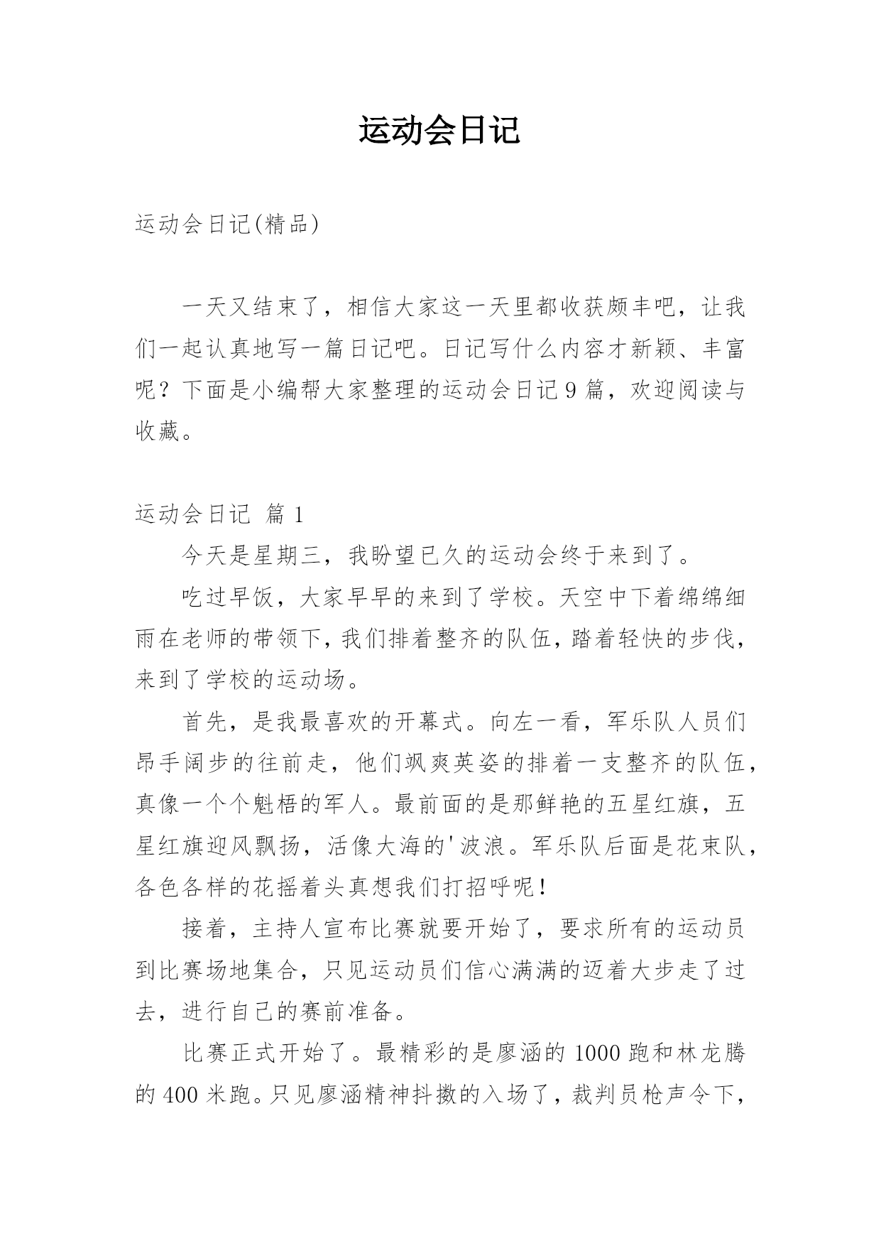 运动会日记运动会日记(精品)一天又结束了,相信大家这一天里都收获颇丰吧,让我们一起认真地写一篇日记吧。日记写什么内容才新颖、丰富呢?下面是小编帮大家整理的运动会日记9篇,欢迎阅读与收藏。运动会日记篇1今天是星期三,我盼望已久的运动会终于来到了。吃过早饭,大家早早的来到了学校。天空中下着绵绵细雨在老师的带领下,我们排着整齐的队伍,踏着轻快的步伐,来到了学校的运动场。首先,是我最喜欢的开幕式。向左一看,军乐队人员们昂手阔步的往前走,他们飒爽英姿的排着一支整齐的队伍,真像一个个魁梧的军人。最前面的是那鲜艳的五星