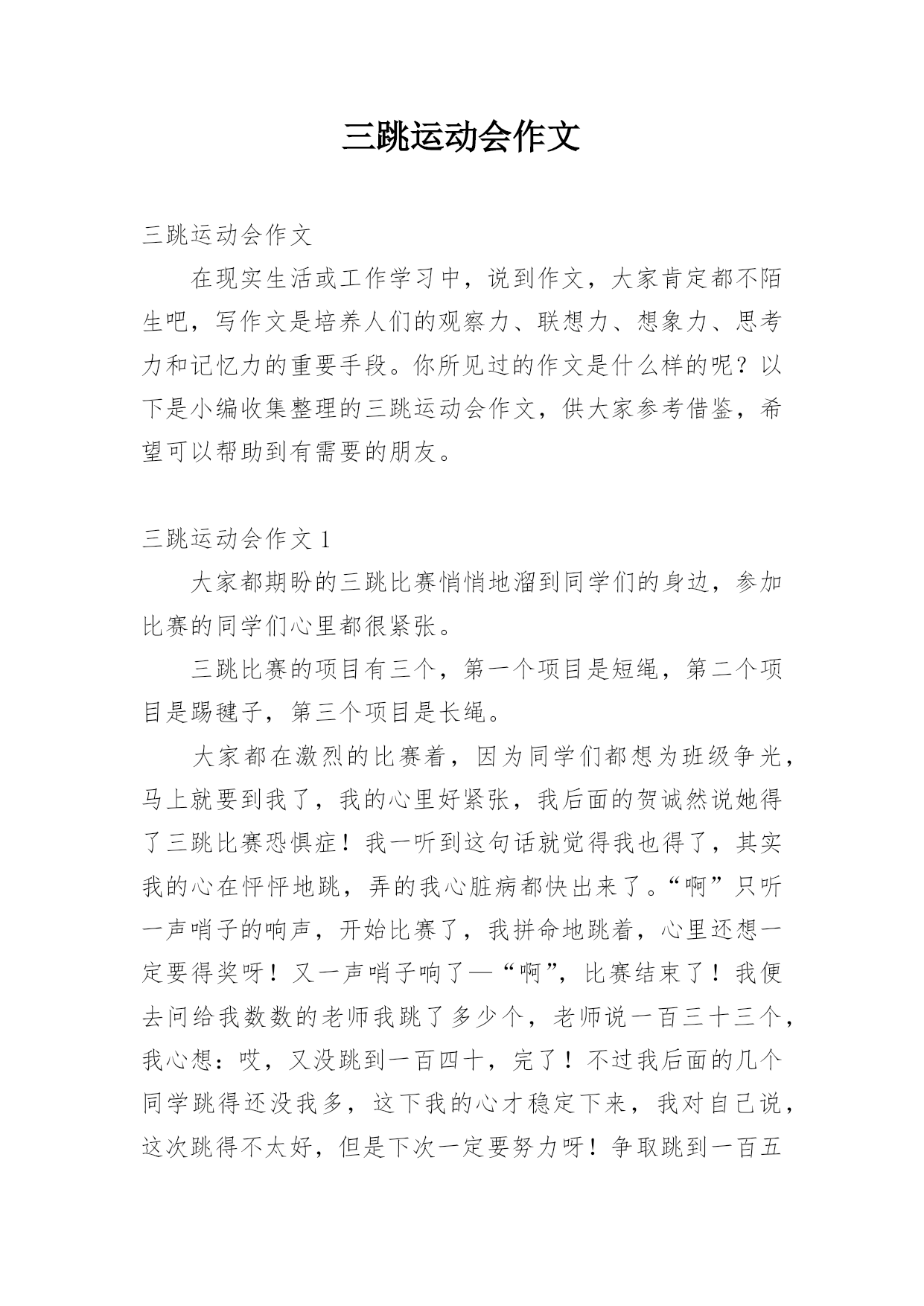 三跳运动会作文三跳运动会作文在现实生活或工作学习中,说到作文,大家肯定都不陌生吧,写作文是培养人们的观察力、联想力、想象力、思考力和记忆力的重要手段。你所见过的作文是什么样的呢?以下是小编收集整理的三跳运动会作文,供大家参考借鉴,希望可以帮助到有需要的朋友。三跳运动会作文1大家都期盼的三跳比赛悄悄地溜到同学们的身边,参加比赛的同学们心里都很紧张。三跳比赛的项目有三个,第一个项目是短绳,第二个项目是踢毽子,第三个项目是长绳。大家都在激烈的比赛着,因为同学们都想为班级争光,马上就要到我了,我的心里好紧张,我后