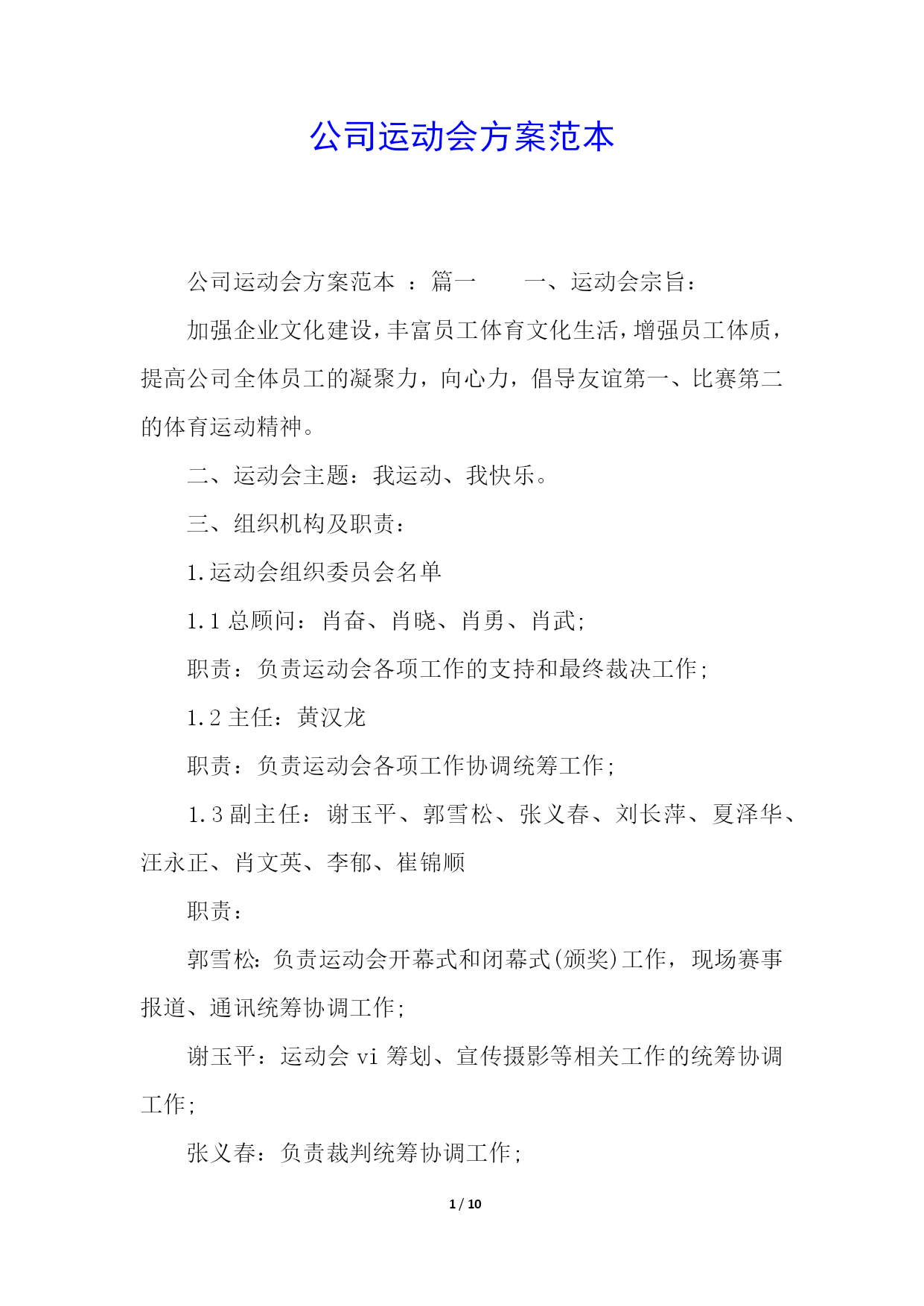 PAGE10/NUMPAGES10公司运动会方案范本公司运动会方案范本:篇一一、运动会宗旨:加强企业文化建设,丰富员工体育文化生活,增强员工体质,提高公司全体员工的凝聚力,向心力,倡导友谊第一、比赛第二的体育运动精神。二、运动会主题:我运动、我快乐。三、组织机构及职责:1.运动会组织委员会名单1.1总顾问:肖奋、肖晓、肖勇、肖武;职责:负责运动会各项工作的支持和最终裁决工作;1.2主任:黄汉龙职责:负责运动会各项工作协调统筹工作;1.3副主任:谢玉平、郭雪松、张义春、刘长萍、夏泽华、汪永正、肖
