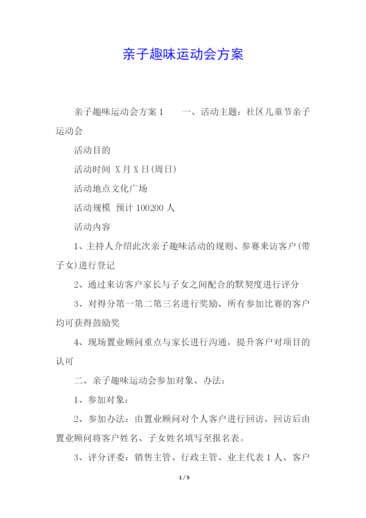 PAGE5/NUMPAGES5亲子趣味运动会方案亲子趣味运动会方案1一、活动主题:社区儿童节亲子运动会活动目的活动时间X月X日(周日)活动地点文化广场活动规模预计100200人活动内容1、主持人介绍此次亲子趣味活动的规则、参赛来访客户(带子女)进行登记2、通过来访客户家长与子女之间配合的默契度进行评分3、对得分第一第二第三名进行奖励、所有参加比赛的客户均可获得鼓励奖4、现场置业顾问重点与家长进行沟通,提升客户对项目的认可二、亲子趣味运动会参加对象、办法:1、参加对象:2、参加办法:由置业顾问对