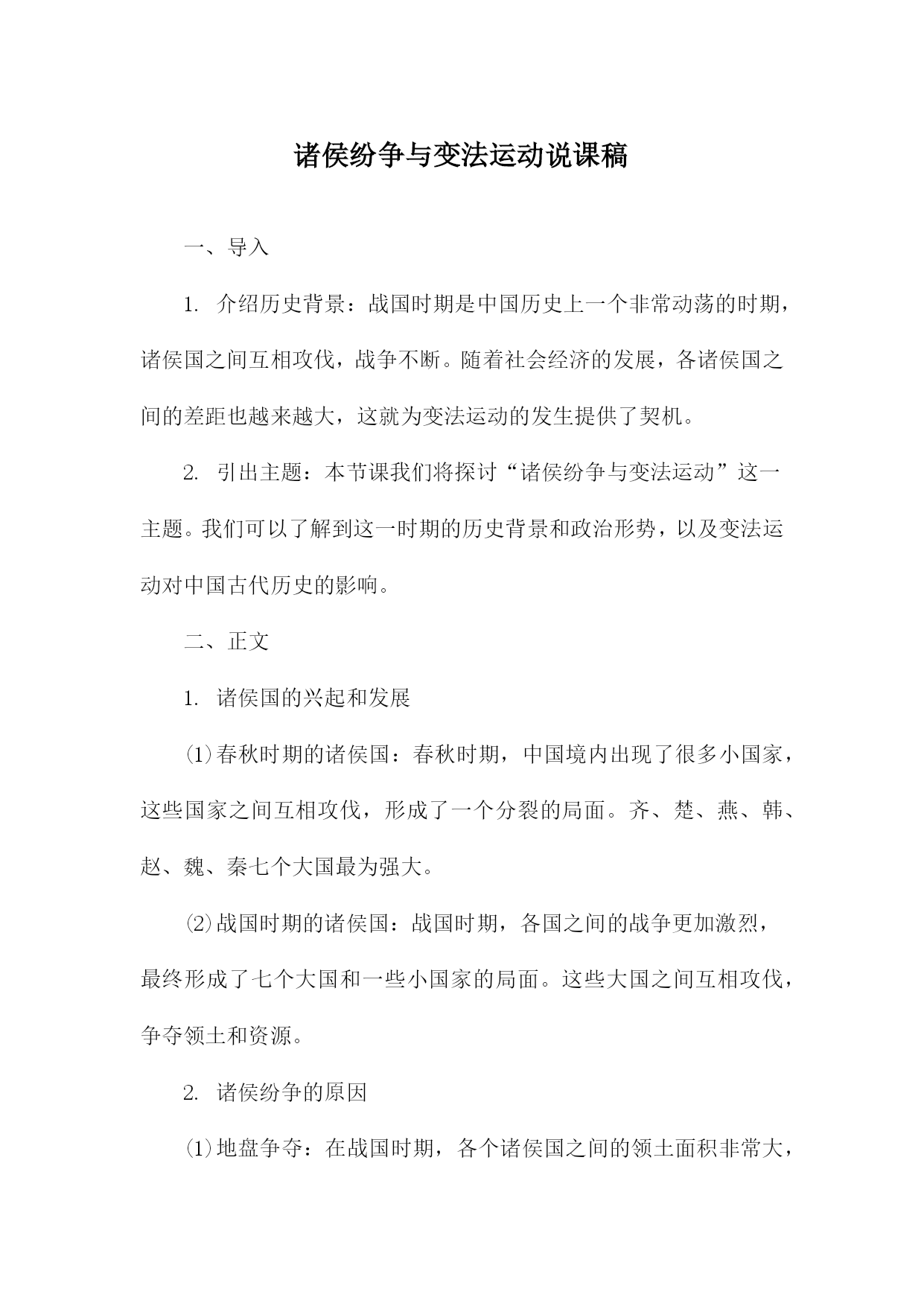 诸侯纷争与变法运动说课稿一、导入1.介绍历史背景:战国时期是中国历史上一个非常动荡的时期,诸侯国之间互相攻伐,战争不断。随着社会经济的发展,各诸侯国之间的差距也越来越大,这就为变法运动的发生提供了契机。2.引出主题:本节课我们将探讨“诸侯纷争与变法运动”这一主题。我们可以了解到这一时期的历史背景和政治形势,以及变法运动对中国古代历史的影响。二、正文1.诸侯国的兴起和发展(1)春秋时期的诸侯国:春秋时期,中国境内出现了很多小国家,这些国家之间互相攻伐,形成了一个分裂的局面。齐、楚、燕、韩、赵、魏、秦七个大国