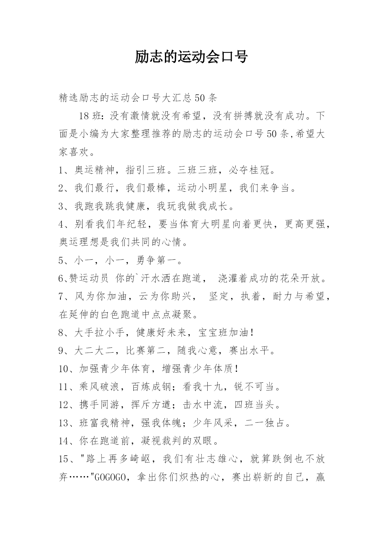 励志的运动会口号精选励志的运动会口号大汇总50条18班:没有激情就没有希望,没有拼搏就没有成功。下面是小编为大家整理推荐的励志的运动会口号50条,希望大家喜欢。1、奥运精神,指引三班。三班三班,必夺桂冠。2、我们最行,我们最棒,运动小明星,我们来争当。3、我跑我跳我健康,我玩我做我成长。4、别看我们年纪轻,要当体育大明星向着更快,更高更强,奥运理想是我们共同的心情。5、小一,小一,勇争第一。6、赞运动员你的`汗水洒在跑道,浇灌着成功的花朵开放。7、风为你加油,云为你助兴,坚定,执着,耐力与希望,在延伸的白