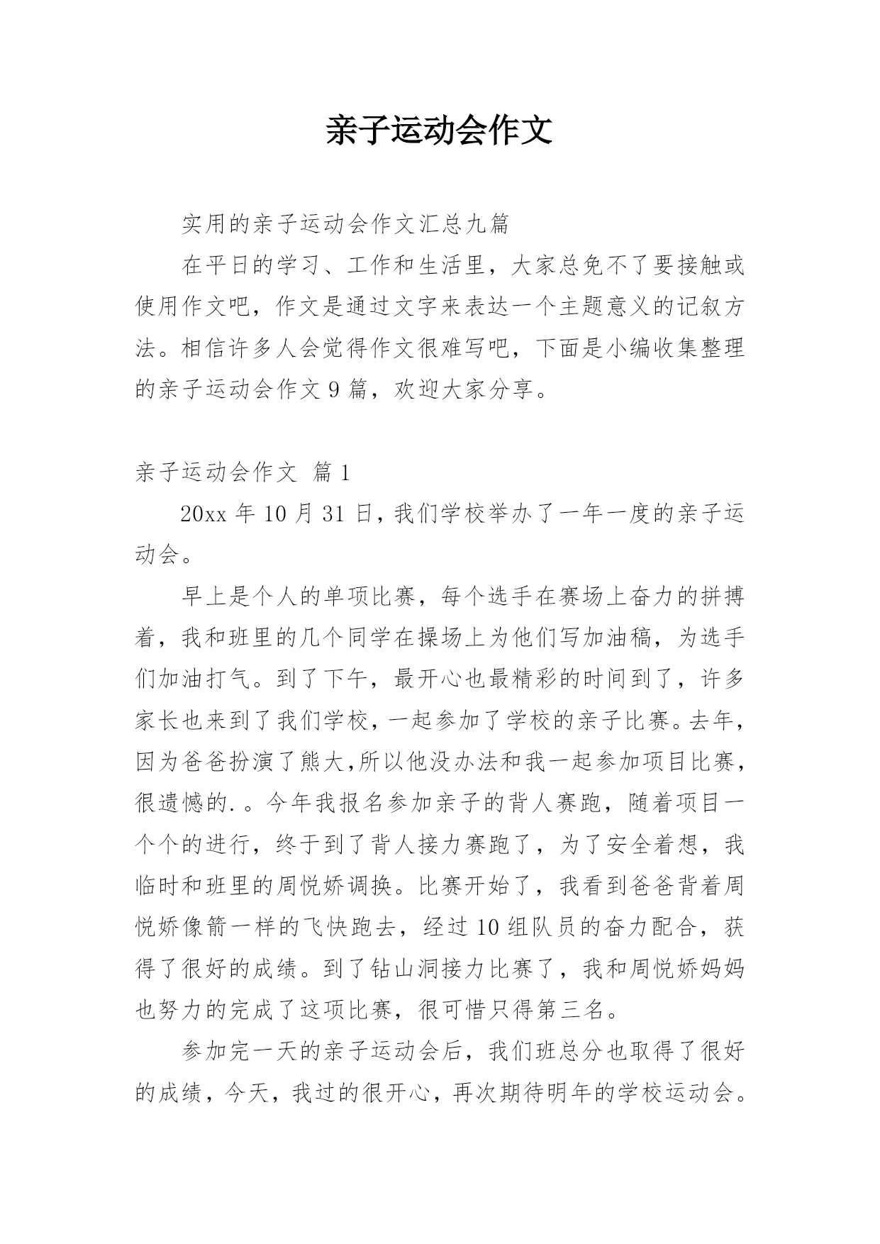 亲子运动会作文实用的亲子运动会作文汇总九篇在平日的学习、工作和生活里,大家总免不了要接触或使用作文吧,作文是通过文字来表达一个主题意义的记叙方法。相信许多人会觉得作文很难写吧,下面是小编收集整理的亲子运动会作文9篇,欢迎大家分享。亲子运动会作文篇120xx年10月31日,我们学校举办了一年一度的亲子运动会。早上是个人的单项比赛,每个选手在赛场上奋力的拼搏着,我和班里的几个同学在操场上为他们写加油稿,为选手们加油打气。到了下午,最开心也最精彩的时间到了,许多家长也来到了我们学校,一起参加了学校的亲子比赛。去
