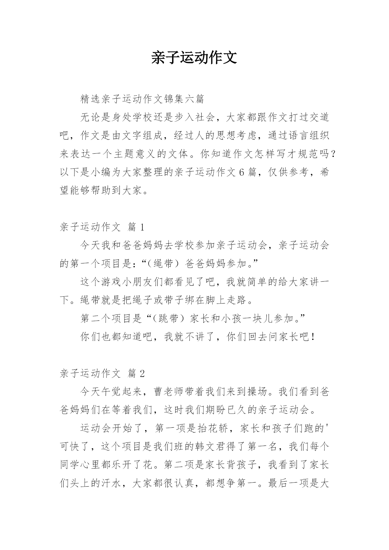 亲子运动作文精选亲子运动作文锦集六篇无论是身处学校还是步入社会,大家都跟作文打过交道吧,作文是由文字组成,经过人的思想考虑,通过语言组织来表达一个主题意义的文体。你知道作文怎样写才规范吗?以下是小编为大家整理的亲子运动作文6篇,仅供参考,希望能够帮助到大家。亲子运动作文篇1今天我和爸爸妈妈去学校参加亲子运动会,亲子运动会的第一个项目是:“(绳带)爸爸妈妈参加。”这个游戏小朋友们都看见了吧,我就简单的给大家讲一下。绳带就是把绳子或带子绑在脚上走路。第二个项目是“(跳带)家长和小孩一块儿参加。”你们也都知道吧