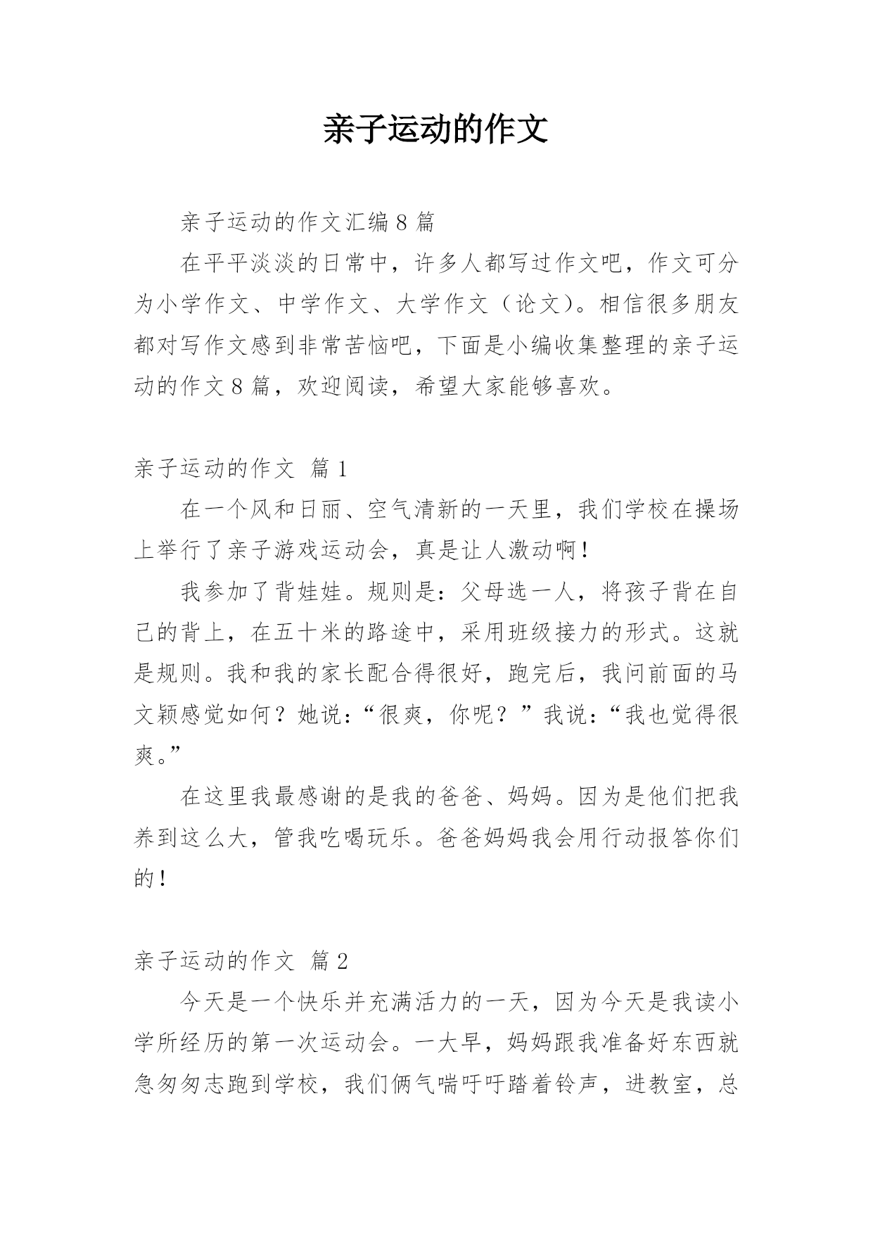 亲子运动的作文亲子运动的作文汇编8篇在平平淡淡的日常中,许多人都写过作文吧,作文可分为小学作文、中学作文、大学作文(论文)。相信很多朋友都对写作文感到非常苦恼吧,下面是小编收集整理的亲子运动的作文8篇,欢迎阅读,希望大家能够喜欢。亲子运动的作文篇1在一个风和日丽、空气清新的一天里,我们学校在操场上举行了亲子游戏运动会,真是让人激动啊!我参加了背娃娃。规则是:父母选一人,将孩子背在自己的背上,在五十米的路途中,采用班级接力的形式。这就是规则。我和我的家长配合得很好,跑完后,我问前面的马文颖感觉如何?她说:“