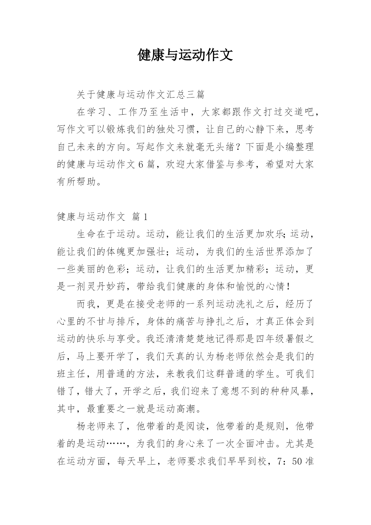 健康与运动作文关于健康与运动作文汇总三篇在学习、工作乃至生活中,大家都跟作文打过交道吧,写作文可以锻炼我们的独处习惯,让自己的心静下来,思考自己未来的方向。写起作文来就毫无头绪?下面是小编整理的健康与运动作文6篇,欢迎大家借鉴与参考,希望对大家有所帮助。健康与运动作文篇1生命在于运动。运动,能让我们的生活更加欢乐;运动,能让我们的体魄更加强壮;运动,为我们的生活世界添加了一些美丽的色彩;运动,让我们的生活更加精彩;运动,更是一剂灵丹妙药,带给我们健康的身体和愉悦的心情!而我,更是在接受老师的一系列运动洗礼