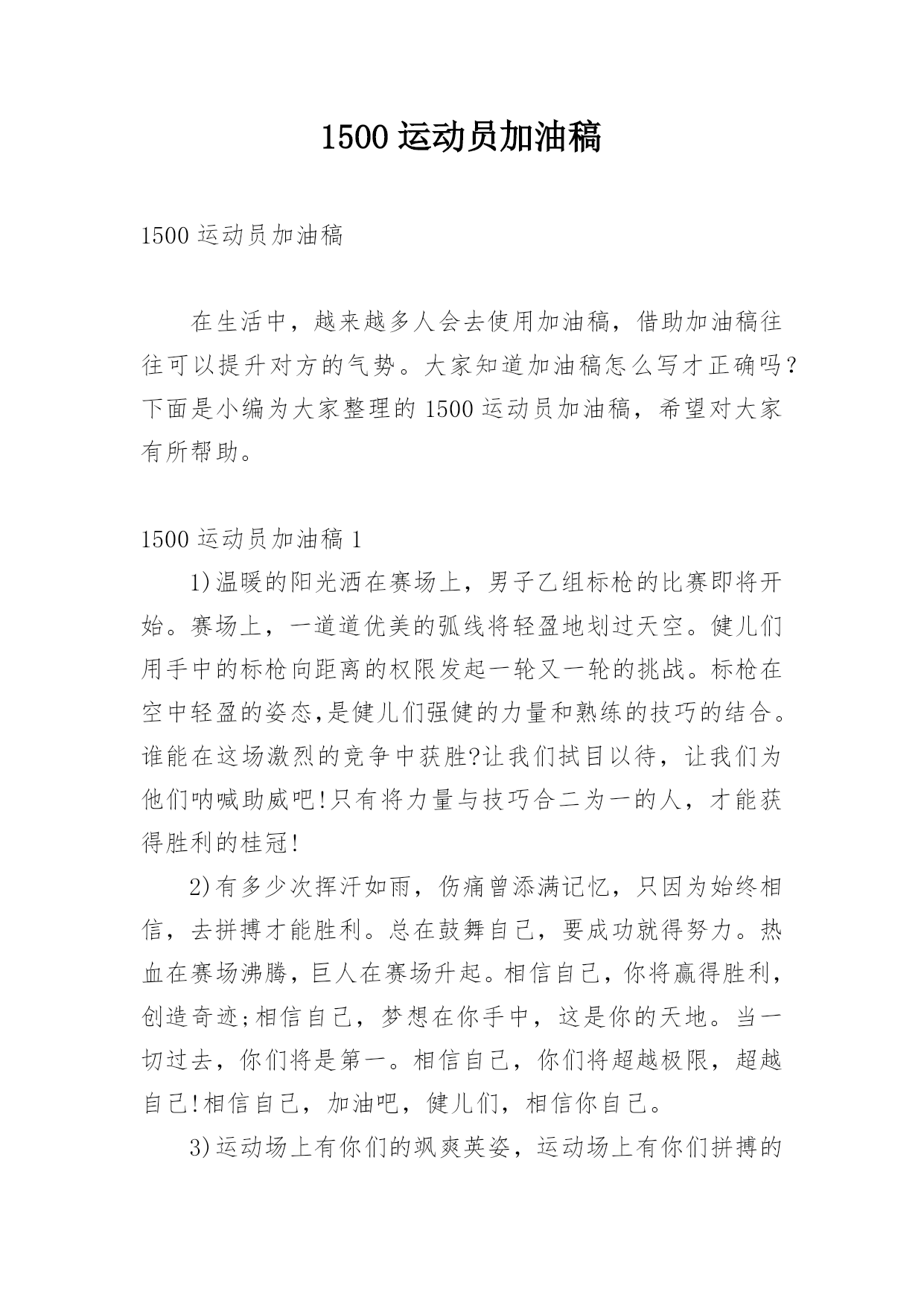 1500运动员加油稿1500运动员加油稿在生活中,越来越多人会去使用加油稿,借助加油稿往往可以提升对方的气势。大家知道加油稿怎么写才正确吗?下面是小编为大家整理的1500运动员加油稿,希望对大家有所帮助。1500运动员加油稿11)温暖的阳光洒在赛场上,男子乙组标枪的比赛即将开始。赛场上,一道道优美的弧线将轻盈地划过天空。健儿们用手中的标枪向距离的权限发起一轮又一轮的挑战。标枪在空中轻盈的姿态,是健儿们强健的力量和熟练的技巧的结合。谁能在这场激烈的竞争中获胜?让我们拭目以待,让我们为他们呐喊助威吧!只有将力