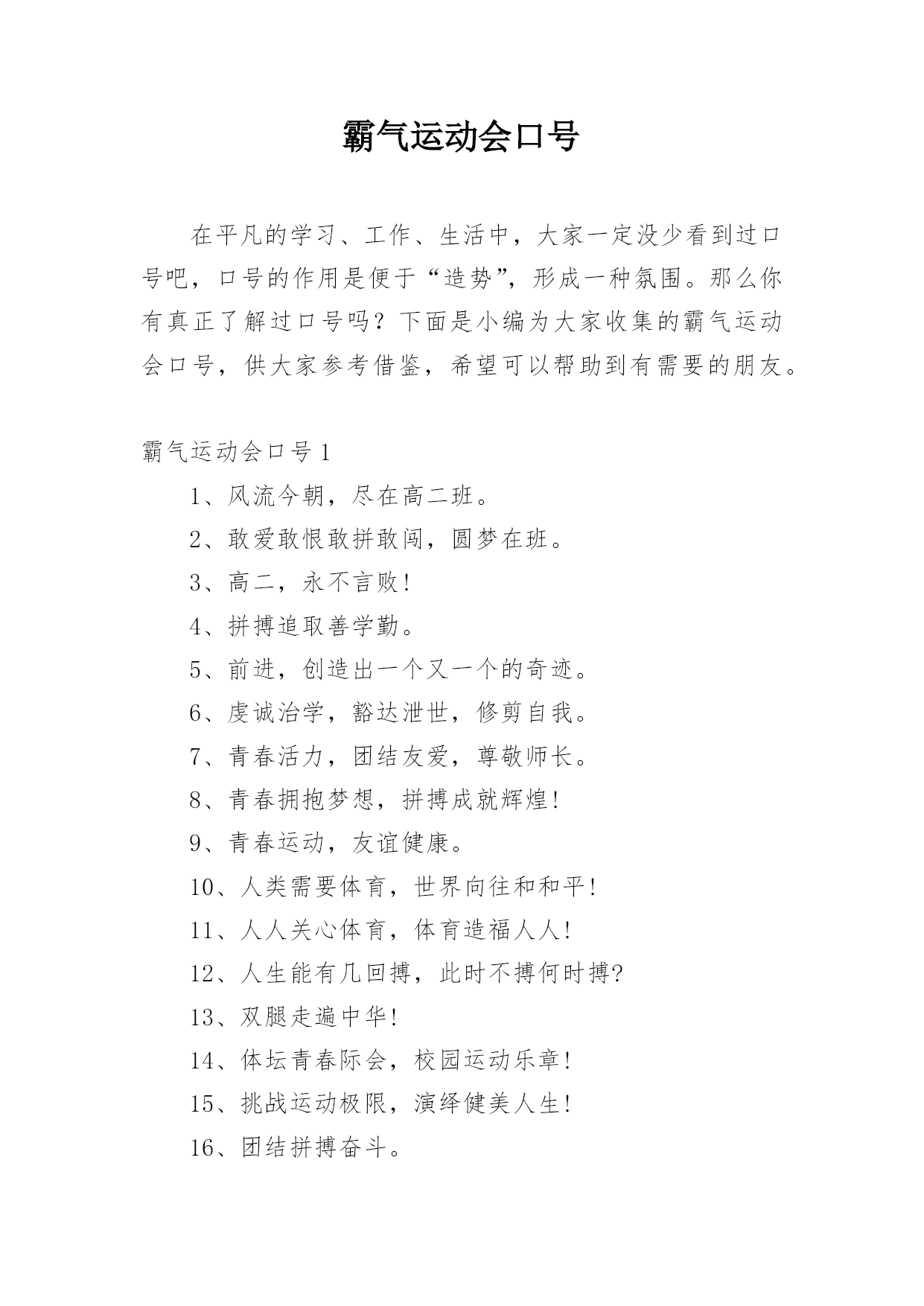 霸气运动会口号在平凡的学习、工作、生活中,大家一定没少看到过口号吧,口号的作用是便于“造势”,形成一种氛围。那么你有真正了解过口号吗?下面是小编为大家收集的霸气运动会口号,供大家参考借鉴,希望可以帮助到有需要的朋友。霸气运动会口号11、风流今朝,尽在高二班。2、敢爱敢恨敢拼敢闯,圆梦在班。3、高二,永不言败!4、拼搏追取善学勤。5、前进,创造出一个又一个的奇迹。6、虔诚治学,豁达泄世,修剪自我。7、青春活力,团结友爱,尊敬师长。8、青春拥抱梦想,拼搏成就辉煌!9、青春运动,友谊健康。10、人类需要体育,世