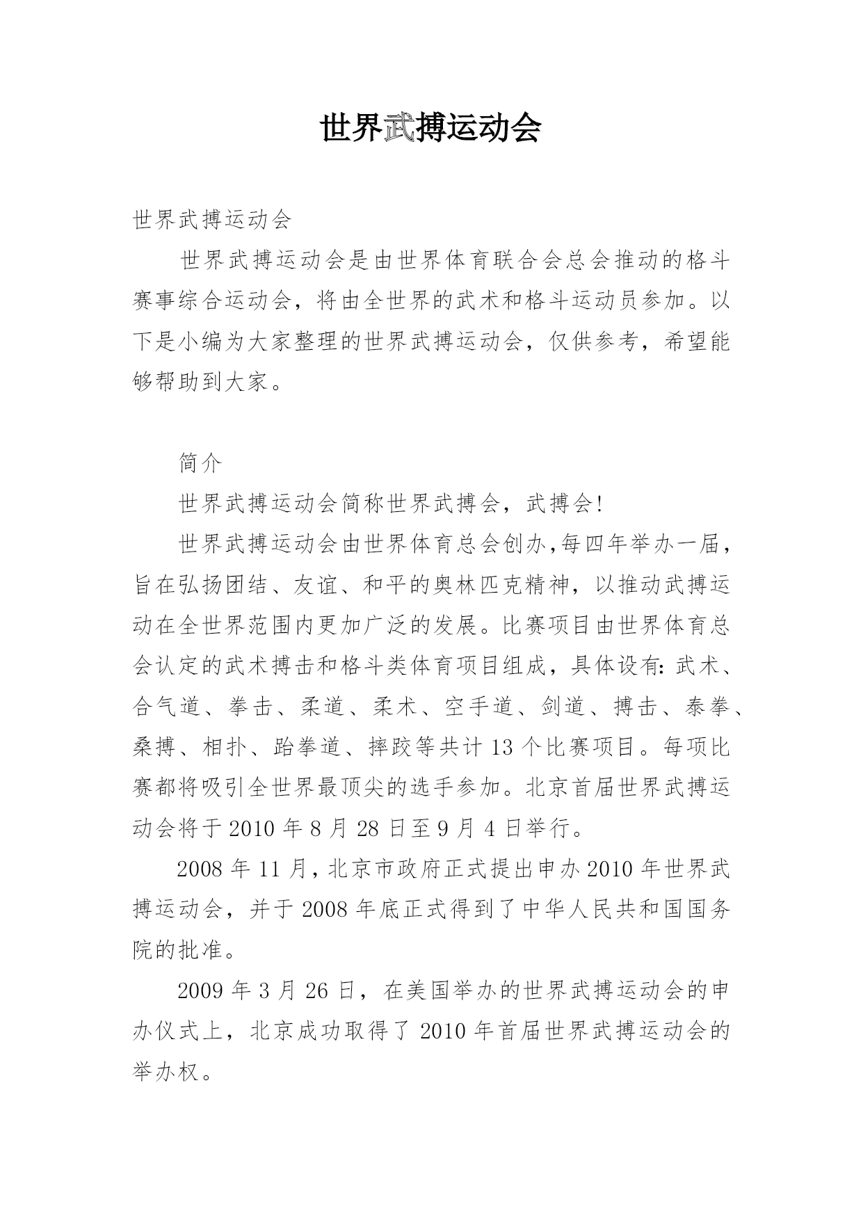 世界武搏运动会世界武搏运动会世界武搏运动会是由世界体育联合会总会推动的格斗赛事综合运动会,将由全世界的武术和格斗运动员参加。以下是小编为大家整理的世界武搏运动会,仅供参考,希望能够帮助到大家。简介世界武搏运动会简称世界武搏会,武搏会!世界武搏运动会由世界体育总会创办,每四年举办一届,旨在弘扬团结、友谊、和平的奥林匹克精神,以推动武搏运动在全世界范围内更加广泛的发展。比赛项目由世界体育总会认定的武术搏击和格斗类体育项目组成,具体设有:武术、合气道、拳击、柔道、柔术、空手道、剑道、搏击、泰拳、桑搏、相扑、跆拳