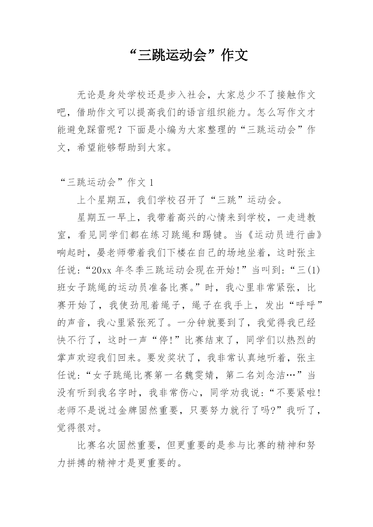 “三跳运动会”作文无论是身处学校还是步入社会,大家总少不了接触作文吧,借助作文可以提高我们的语言组织能力。怎么写作文才能避免踩雷呢?下面是小编为大家整理的“三跳运动会”作文,希望能够帮助到大家。“三跳运动会”作文1上个星期五,我们学校召开了“三跳”运动会。星期五一早上,我带着高兴的心情来到学校,一走进教室,看见同学们都在练习跳绳和踢键。当《运动员进行曲》响起时,晏老师带着我们下楼在自己的场地坐着,这时张主任说:“20xx年冬季三跳运动会现在开始!”当叫到:“三(1)班女子跳绳的运动员准备比赛。”时,我心里