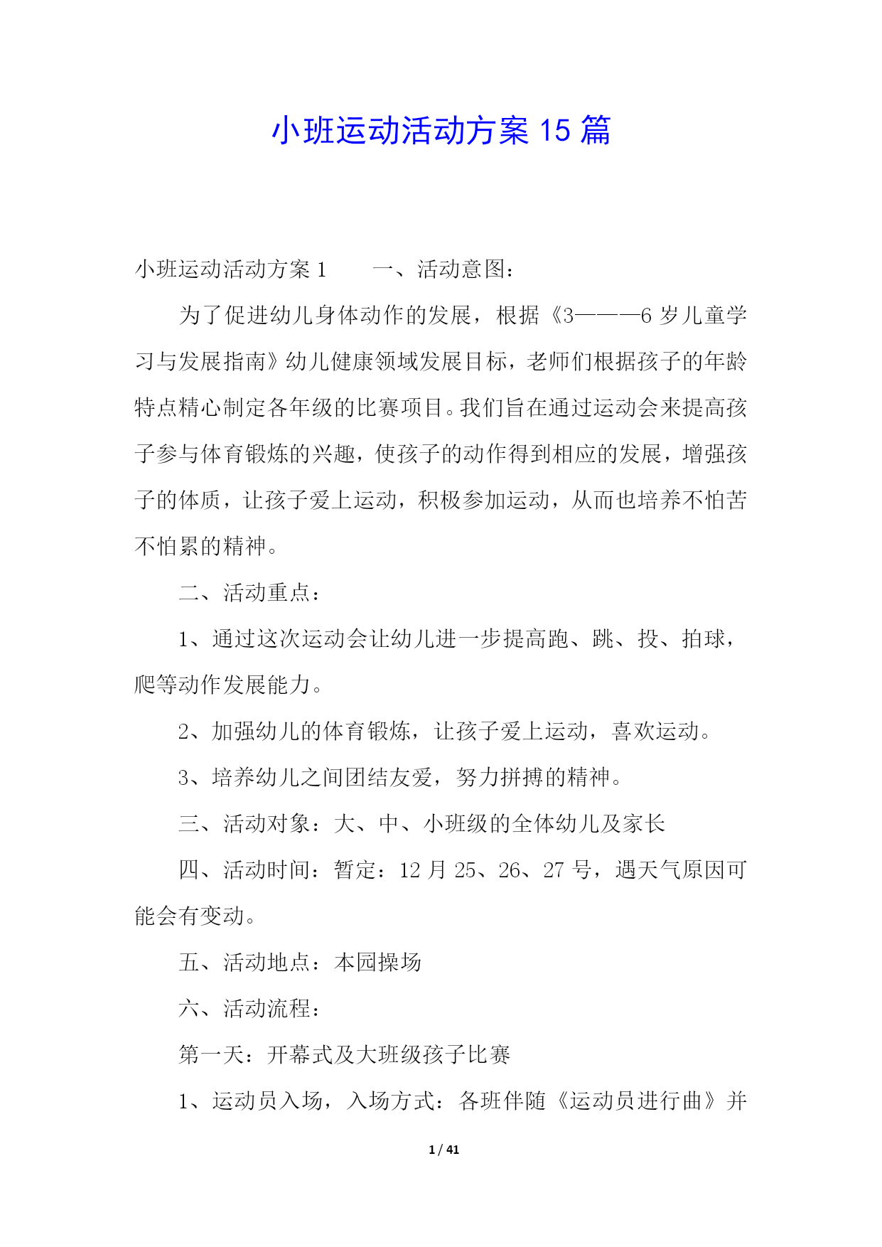 PAGE41/NUMPAGES41小班运动活动方案15篇小班运动活动方案1一、活动意图:为了促进幼儿身体动作的发展,根据《3———6岁儿童学习与发展指南》幼儿健康领域发展目标,老师们根据孩子的年龄特点精心制定各年级的比赛项目。我们旨在通过运动会来提高孩子参与体育锻炼的兴趣,使孩子的动作得到相应的发展,增强孩子的体质,让孩子爱上运动,积极参加运动,从而也培养不怕苦不怕累的精神。二、活动重点:1、通过这次运动会让幼儿进一步提高跑、跳、投、拍球,爬等动作发展能力。2、加强幼儿的体育锻炼,让孩子爱上运