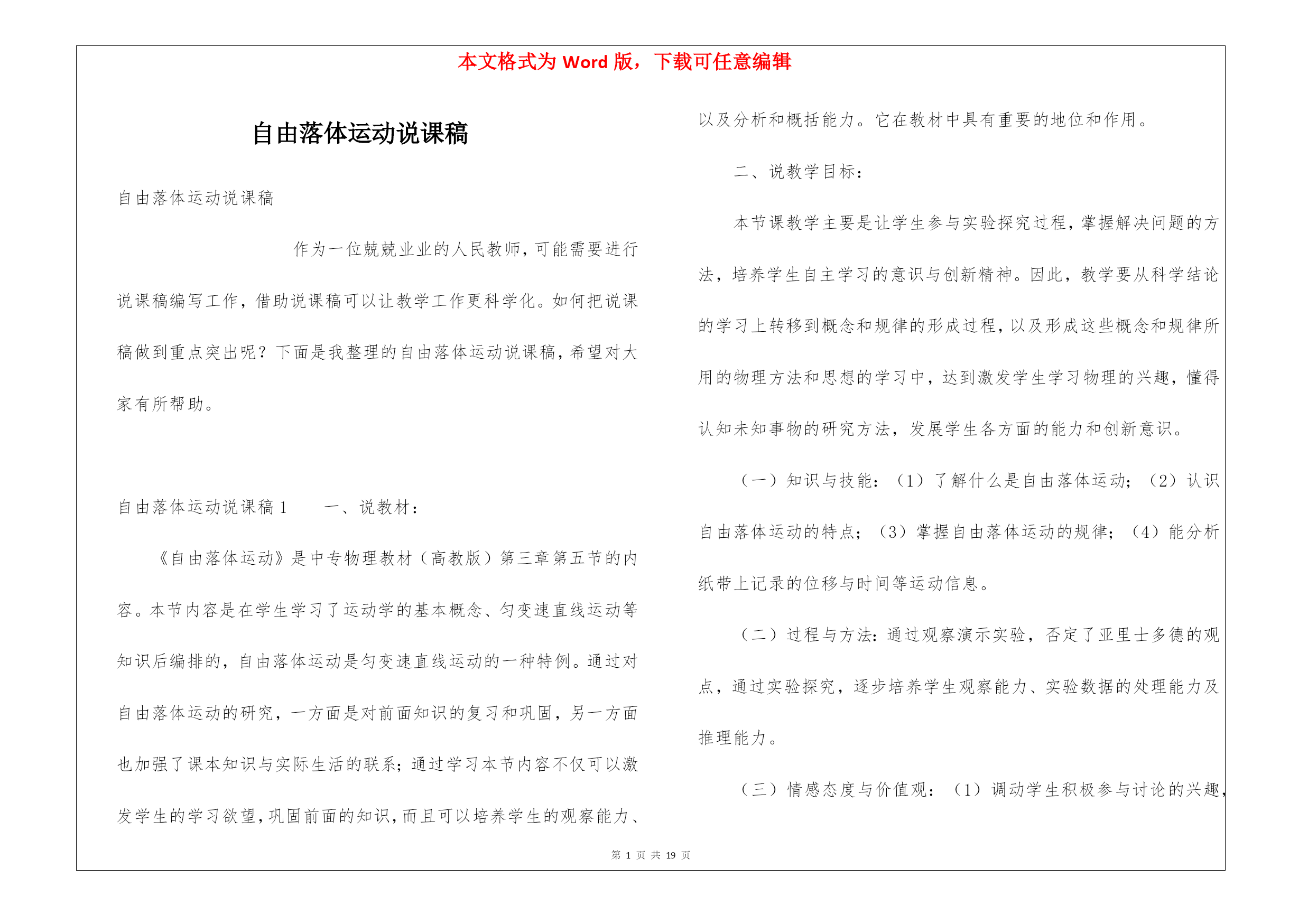 本文格式为Word版,下载可任意编辑第PAGE\*MERGEFORMAT19页共NUMPAGES\*MERGEFORMAT19页自由落体运动说课稿自由落体运动说课稿作为一位兢兢业业的人民教师,可能需要进行说课稿编写工作,借助说课稿可以让教学工作更科学化。如何把说课稿做到重点突出呢?下面是我整理的自由落体运动说课稿,希望对大家有所帮助。自由落体运动说课稿1一、说教材:《自由落体运动》是中专物理教材(高教版)第三章第五节的内容。本节内容是在学生学习了运动学的基本概念、匀变速直线运动等知识后编排的,