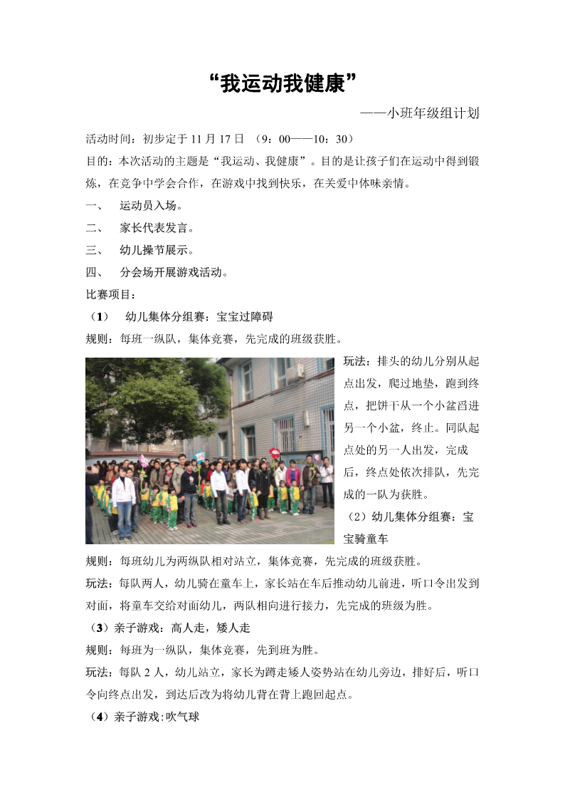 “我运动我健康”——小班年级组计划活动时间:初步定于11月17日(9:00——10:30)目的:本次活动的主题是“我运动、我健康”。目的是让孩子们在运动中得到锻炼,在竞争中学会合作,在游戏中找到快乐,在关爱中体味亲情。一、运动员入场。二、家长代表发言。三、幼儿操节展示。四、分会场开展游戏活动。比赛项目:(1)幼儿集体分组赛:宝宝过障碍规则:每班一纵队,集体竞赛,先完成的班级获胜。玩法:排头的幼儿分别从起点出发,爬过地垫,跑到终点,把饼干从一个小盆舀进另一个小盆,终止。同队起点处的另一人出发,完成后,终点处