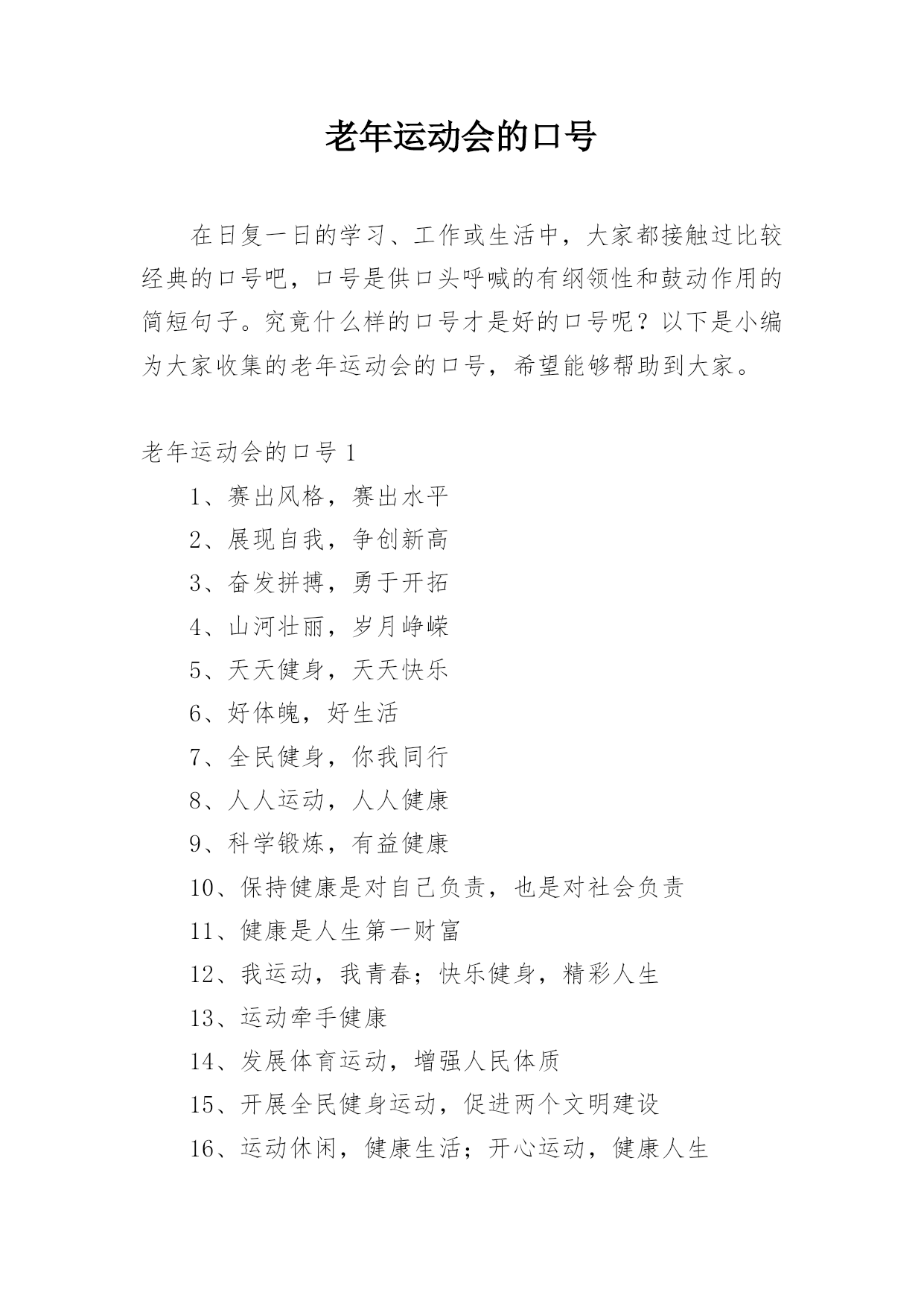 老年运动会的口号在日复一日的学习、工作或生活中,大家都接触过比较经典的口号吧,口号是供口头呼喊的有纲领性和鼓动作用的简短句子。究竟什么样的口号才是好的口号呢?以下是小编为大家收集的老年运动会的口号,希望能够帮助到大家。老年运动会的口号11、赛出风格,赛出水平2、展现自我,争创新高3、奋发拼搏,勇于开拓4、山河壮丽,岁月峥嵘5、天天健身,天天快乐6、好体魄,好生活7、全民健身,你我同行8、人人运动,人人健康9、科学锻炼,有益健康10、保持健康是对自己负责,也是对社会负责11、健康是人生第一财富12、我运动,