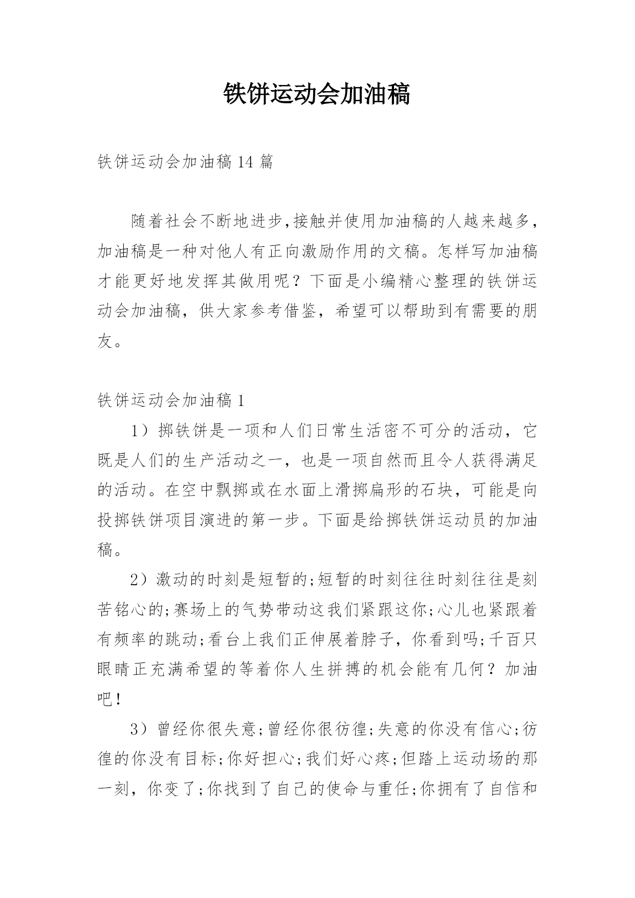 铁饼运动会加油稿铁饼运动会加油稿14篇随着社会不断地进步,接触并使用加油稿的人越来越多,加油稿是一种对他人有正向激励作用的文稿。怎样写加油稿才能更好地发挥其做用呢?下面是小编精心整理的铁饼运动会加油稿,供大家参考借鉴,希望可以帮助到有需要的朋友。铁饼运动会加油稿11)掷铁饼是一项和人们日常生活密不可分的活动,它既是人们的生产活动之一,也是一项自然而且令人获得满足的活动。在空中飘掷或在水面上滑掷扁形的石块,可能是向投掷铁饼项目演进的第一步。下面是给掷铁饼运动员的加油稿。2)激动的时刻是短暂的;短暂的时刻往往