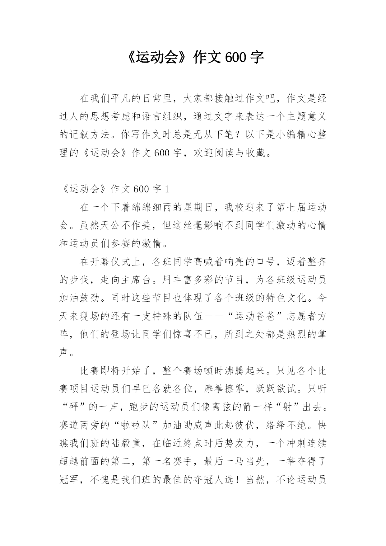 《运动会》作文600字在我们平凡的日常里,大家都接触过作文吧,作文是经过人的思想考虑和语言组织,通过文字来表达一个主题意义的记叙方法。你写作文时总是无从下笔?以下是小编精心整理的《运动会》作文600字,欢迎阅读与收藏。《运动会》作文600字1在一个下着绵绵细雨的星期日,我校迎来了第七届运动会。虽然天公不作美,但这丝毫影响不到同学们激动的心情和运动员们参赛的激情。在开幕仪式上,各班同学高喊着响亮的口号,迈着整齐的步伐,走向主席台。用丰富多彩的节目,为各班级运动员加油鼓劲。同时这些节目也体现了各个班级的特色文