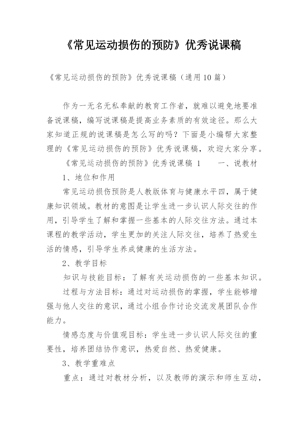 《常见运动损伤的预防》优秀说课稿《常见运动损伤的预防》优秀说课稿(通用10篇)作为一无名无私奉献的教育工作者,就难以避免地要准备说课稿,编写说课稿是提高业务素质的有效途径。那么大家知道正规的说课稿是怎么写的吗?下面是小编帮大家整理的《常见运动损伤的预防》优秀说课稿,欢迎大家分享。《常见运动损伤的预防》优秀说课稿1一、说教材1、地位和作用常见运动损伤预防是人教版体育与健康水平四,属于健康知识领域。教材的意图是让学生进一步认识人际交往的作用,引导学生了解和掌握一些基本的人际交往方法。通过本课程的教学活动,学生