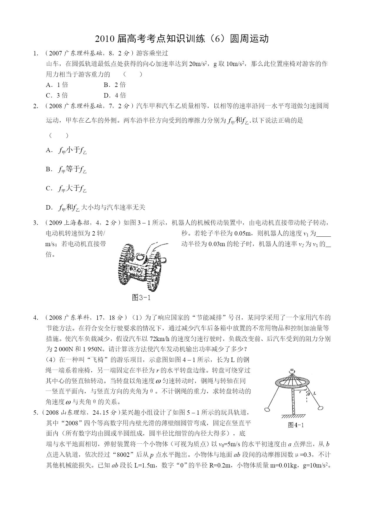 2010届高考考点知识训练(6)圆周运动1.(2007广东理科基础,8,2分)游客乘坐过山车,在圆弧轨道最低点处获得的向心加速率达到20m/s2,g取10m/s2,那么此位置座椅对游客的作用力相当于游客重力的()A.1倍B.2倍C.3倍D.4倍2.(2008广东理科基础,7,2分)汽车甲和汽车乙质量相等,以相等的速率沿同一水平弯道做匀速圆周运动,甲车在乙车的外侧。两车沿半径方向受到的摩擦力分别为以下说法正确的是()A.B.C.D.大小均与汽车速率无关3.(2009上海春招,4,2分)如图3–1所示,机器人