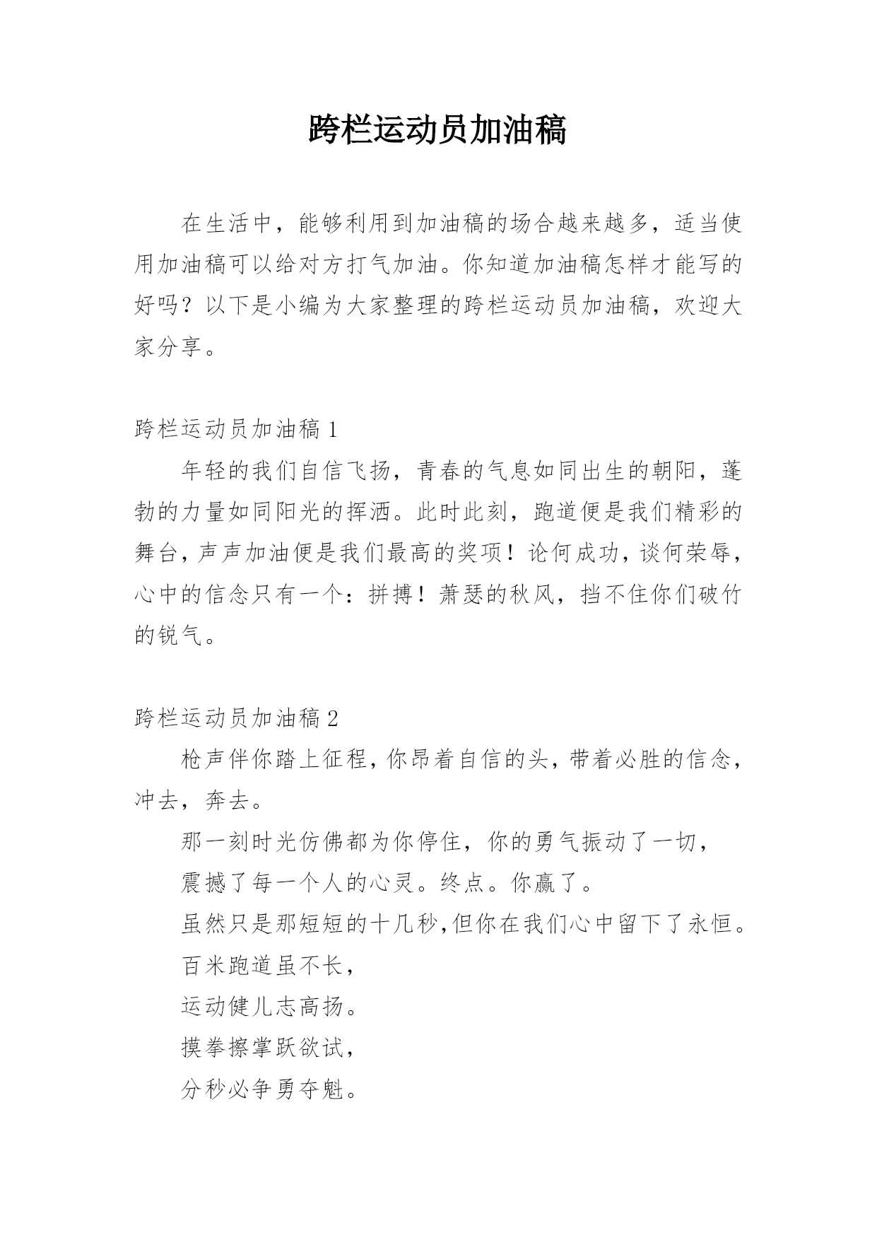跨栏运动员加油稿在生活中,能够利用到加油稿的场合越来越多,适当使用加油稿可以给对方打气加油。你知道加油稿怎样才能写的好吗?以下是小编为大家整理的跨栏运动员加油稿,欢迎大家分享。跨栏运动员加油稿1年轻的我们自信飞扬,青春的气息如同出生的朝阳,蓬勃的力量如同阳光的挥洒。此时此刻,跑道便是我们精彩的舞台,声声加油便是我们最高的奖项!论何成功,谈何荣辱,心中的信念只有一个:拼搏!萧瑟的秋风,挡不住你们破竹的锐气。跨栏运动员加油稿2枪声伴你踏上征程,你昂着自信的头,带着必胜的信念,冲去,奔去。那一刻时光仿佛都为你停