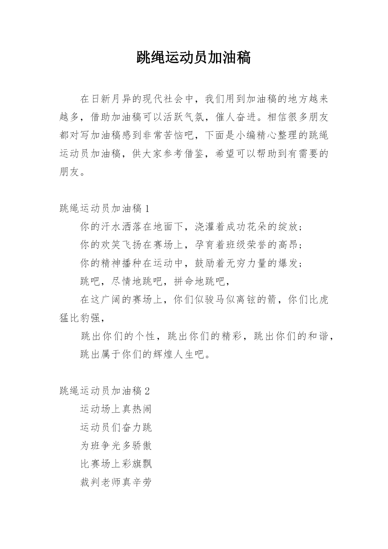 跳绳运动员加油稿在日新月异的现代社会中,我们用到加油稿的地方越来越多,借助加油稿可以活跃气氛,催人奋进。相信很多朋友都对写加油稿感到非常苦恼吧,下面是小编精心整理的跳绳运动员加油稿,供大家参考借鉴,希望可以帮助到有需要的朋友。跳绳运动员加油稿1你的汗水洒落在地面下,浇灌着成功花朵的绽放;你的欢笑飞扬在赛场上,孕育着班级荣誉的高昂;你的精神播种在运动中,鼓励着无穷力量的爆发;跳吧,尽情地跳吧,拼命地跳吧,在这广阔的赛场上,你们似骏马似离铉的箭,你们比虎猛比豹强,跳出你们的个性,跳出你们的精彩,跳出你们的和谐