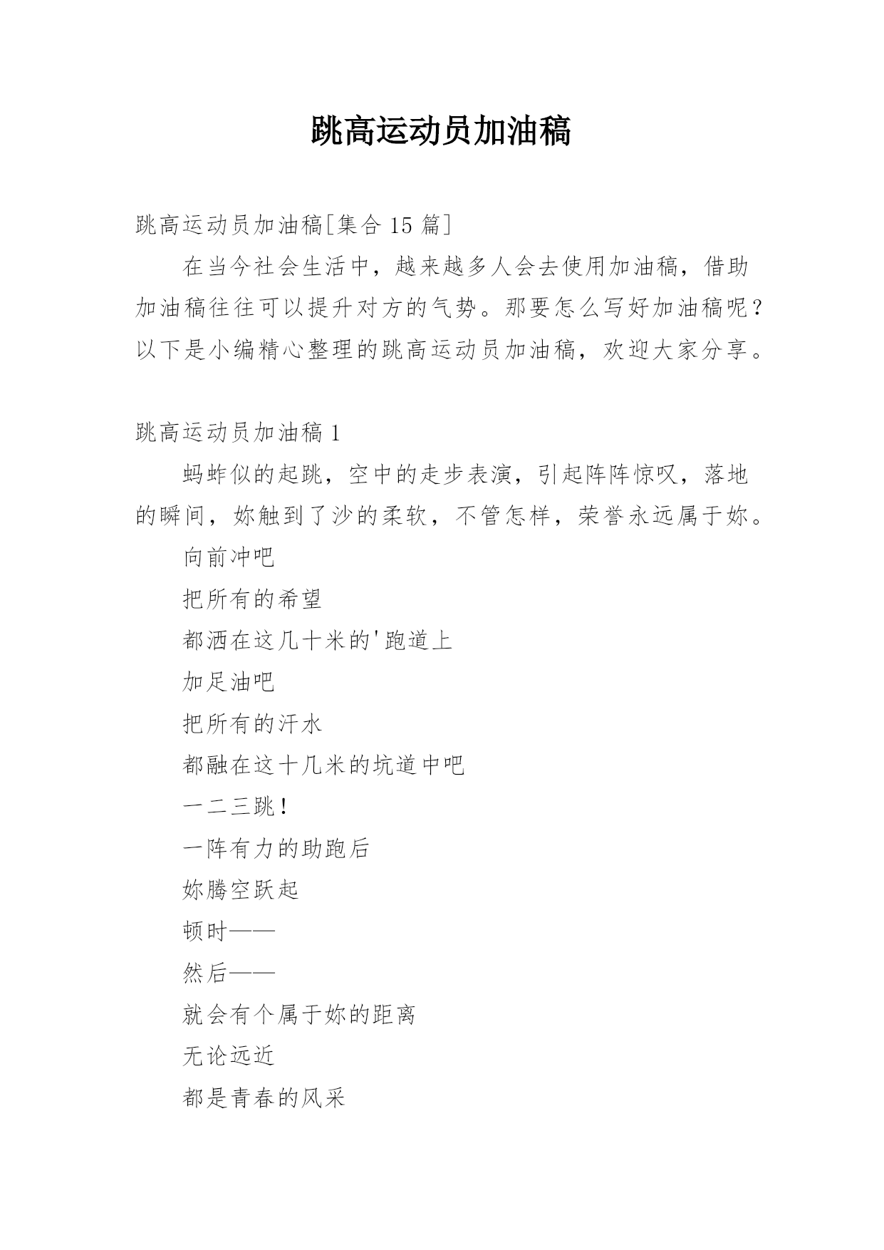 跳高运动员加油稿跳高运动员加油稿[集合15篇]在当今社会生活中,越来越多人会去使用加油稿,借助加油稿往往可以提升对方的气势。那要怎么写好加油稿呢?以下是小编精心整理的跳高运动员加油稿,欢迎大家分享。跳高运动员加油稿1蚂蚱似的起跳,空中的走步表演,引起阵阵惊叹,落地的瞬间,妳触到了沙的柔软,不管怎样,荣誉永远属于妳。向前冲吧把所有的希望都洒在这几十米的'跑道上加足油吧把所有的汗水都融在这十几米的坑道中吧一二三跳!一阵有力的助跑后妳腾空跃起顿时——然后——就会有个属于妳的距离无论远近都是青春的风采无论胜负都是
