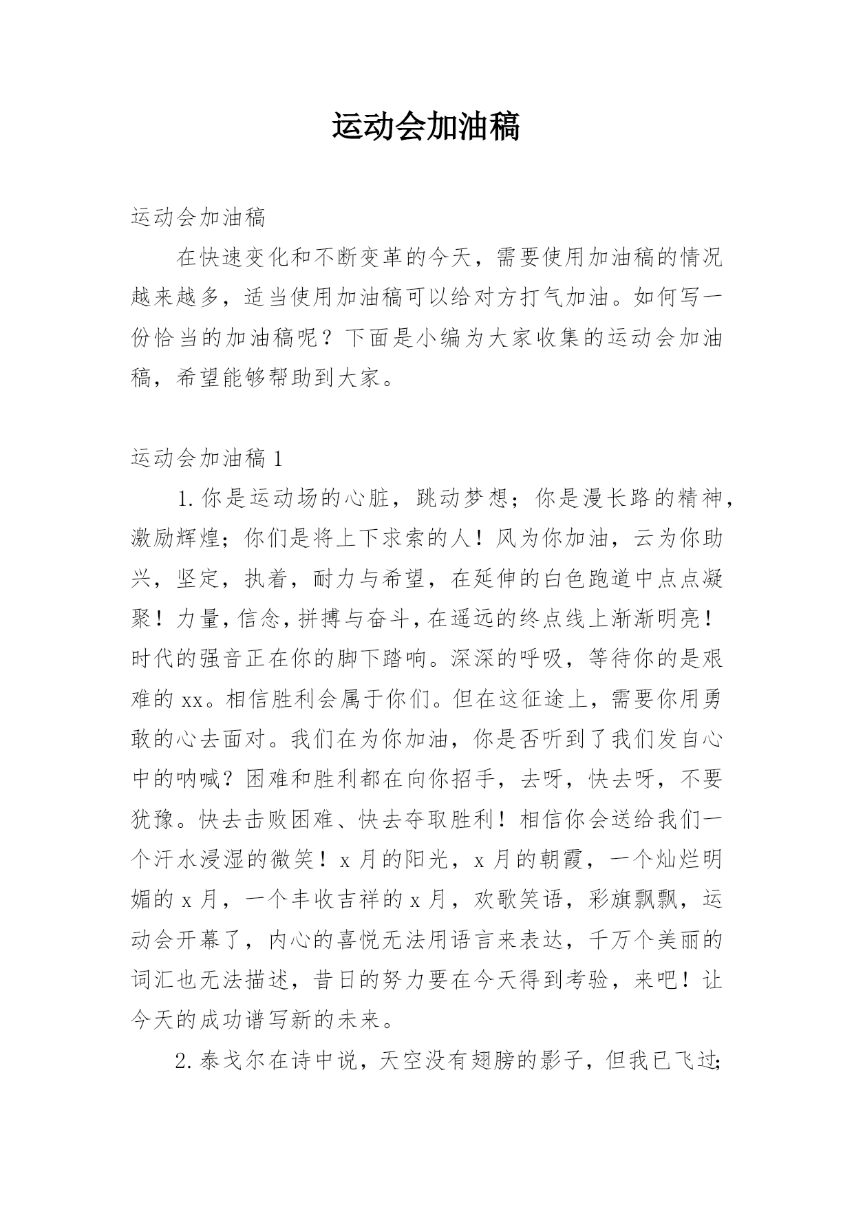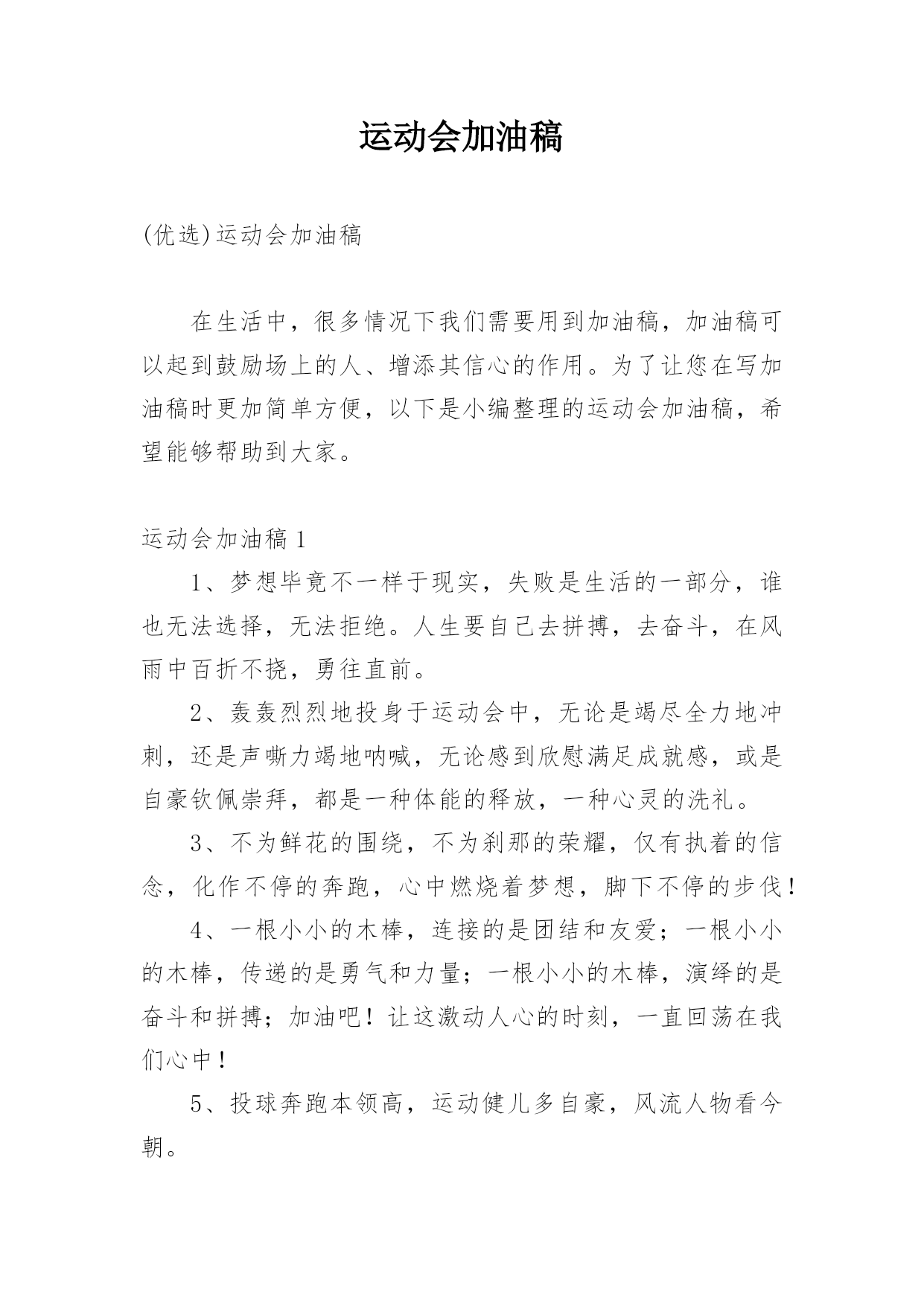 运动会加油稿(优选)运动会加油稿在生活中,很多情况下我们需要用到加油稿,加油稿可以起到鼓励场上的人、增添其信心的作用。为了让您在写加油稿时更加简单方便,以下是小编整理的运动会加油稿,希望能够帮助到大家。运动会加油稿11、梦想毕竟不一样于现实,失败是生活的一部分,谁也无法选择,无法拒绝。人生要自己去拼搏,去奋斗,在风雨中百折不挠,勇往直前。2、轰轰烈烈地投身于运动会中,无论是竭尽全力地冲刺,还是声嘶力竭地呐喊,无论感到欣慰满足成就感,或是自豪钦佩崇拜,都是一种体能的释放,一种心灵的洗礼。3、不为鲜花的围绕,