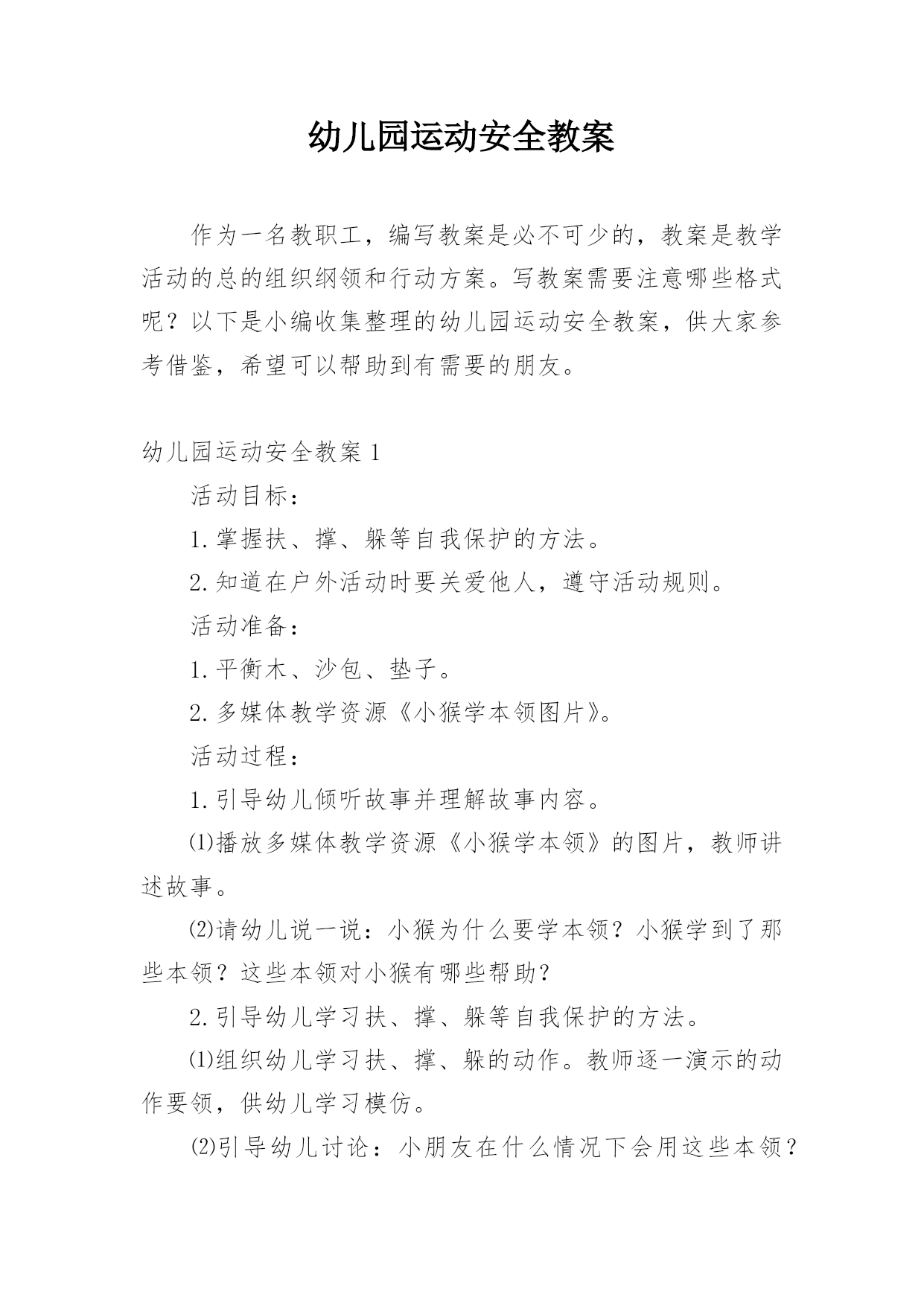 幼儿园运动安全教案作为一名教职工,编写教案是必不可少的,教案是教学活动的总的组织纲领和行动方案。写教案需要注意哪些格式呢?以下是小编收集整理的幼儿园运动安全教案,供大家参考借鉴,希望可以帮助到有需要的朋友。幼儿园运动安全教案1活动目标:1.掌握扶、撑、躲等自我保护的方法。2.知道在户外活动时要关爱他人,遵守活动规则。活动准备:1.平衡木、沙包、垫子。2.多媒体教学资源《小猴学本领图片》。活动过程:1.引导幼儿倾听故事并理解故事内容。⑴播放多媒体教学资源《小猴学本领》的图片,教师讲述故事。⑵请幼儿说一说:小