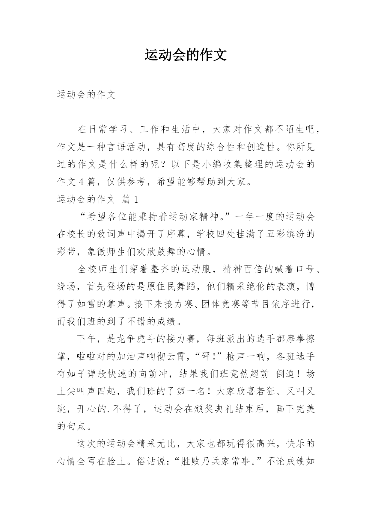 运动会的作文运动会的作文在日常学习、工作和生活中,大家对作文都不陌生吧,作文是一种言语活动,具有高度的综合性和创造性。你所见过的作文是什么样的呢?以下是小编收集整理的运动会的作文4篇,仅供参考,希望能够帮助到大家。运动会的作文篇1“希望各位能秉持着运动家精神。”一年一度的运动会在校长的致词声中揭开了序幕,学校四处挂满了五彩缤纷的彩带,象徵师生们欢欣鼓舞的心情。全校师生们穿着整齐的运动服,精神百倍的喊着口号、绕场,首先登场的是原住民舞蹈,他们精采绝伦的表演,博得了如雷的掌声。接下来接力赛、团体竞赛等节目依序