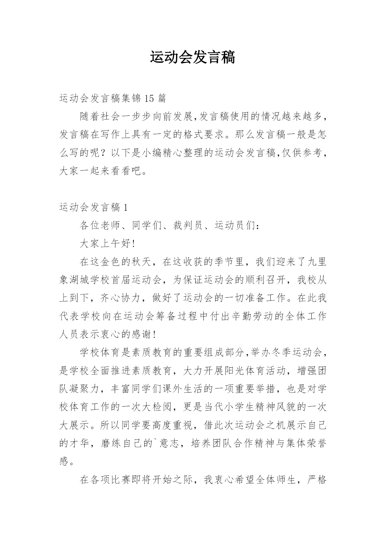 运动会发言稿运动会发言稿集锦15篇随着社会一步步向前发展,发言稿使用的情况越来越多,发言稿在写作上具有一定的格式要求。那么发言稿一般是怎么写的呢?以下是小编精心整理的运动会发言稿,仅供参考,大家一起来看看吧。运动会发言稿1各位老师、同学们、裁判员、运动员们:大家上午好!在这金色的秋天,在这收获的季节里,我们迎来了九里象湖城学校首届运动会,为保证运动会的顺利召开,我校从上到下,齐心协力,做好了运动会的一切准备工作。在此我代表学校向在运动会筹备过程中付出辛勤劳动的全体工作人员表示衷心的感谢!学校体育是素质教育