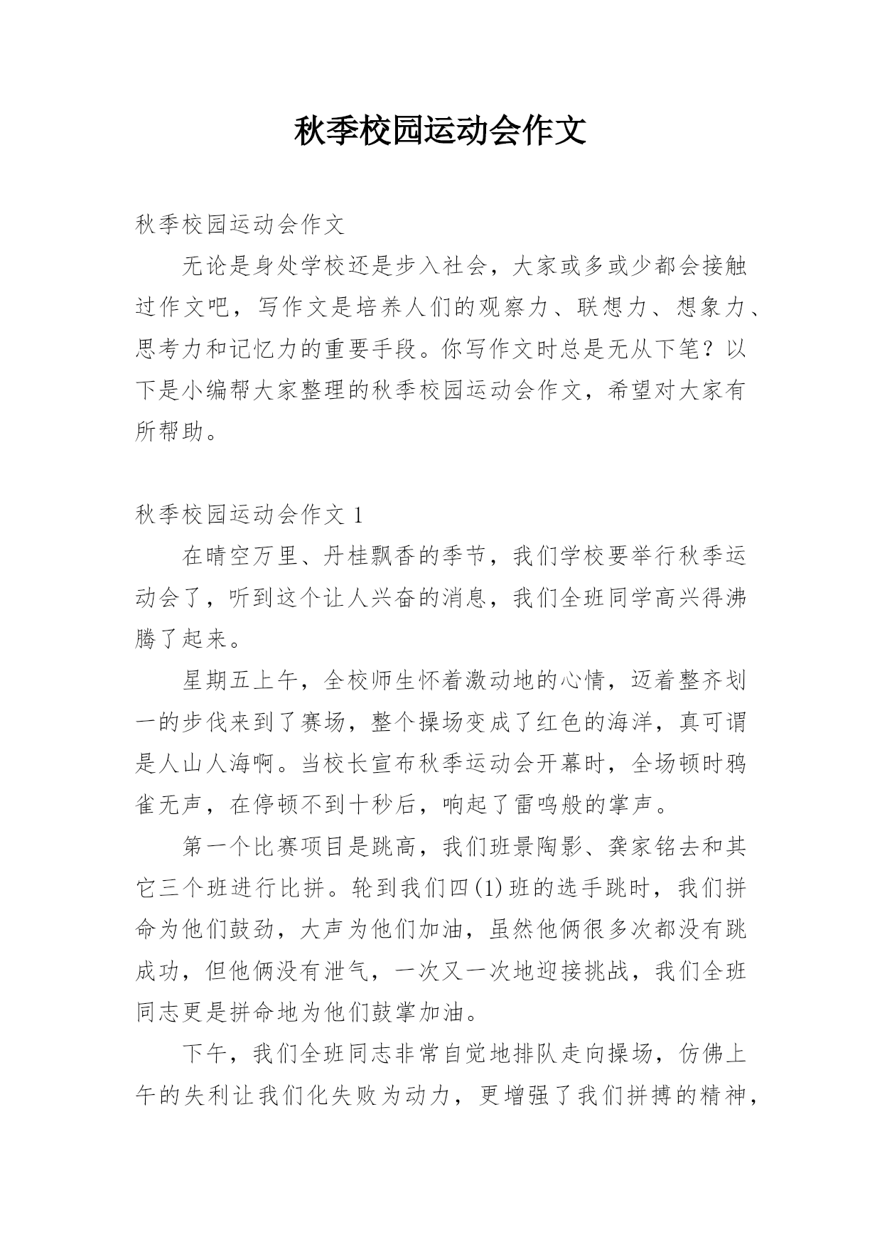 秋季校园运动会作文秋季校园运动会作文无论是身处学校还是步入社会,大家或多或少都会接触过作文吧,写作文是培养人们的观察力、联想力、想象力、思考力和记忆力的重要手段。你写作文时总是无从下笔?以下是小编帮大家整理的秋季校园运动会作文,希望对大家有所帮助。秋季校园运动会作文1在晴空万里、丹桂飘香的季节,我们学校要举行秋季运动会了,听到这个让人兴奋的消息,我们全班同学高兴得沸腾了起来。星期五上午,全校师生怀着激动地的心情,迈着整齐划一的步伐来到了赛场,整个操场变成了红色的海洋,真可谓是人山人海啊。当校长宣布秋季运动