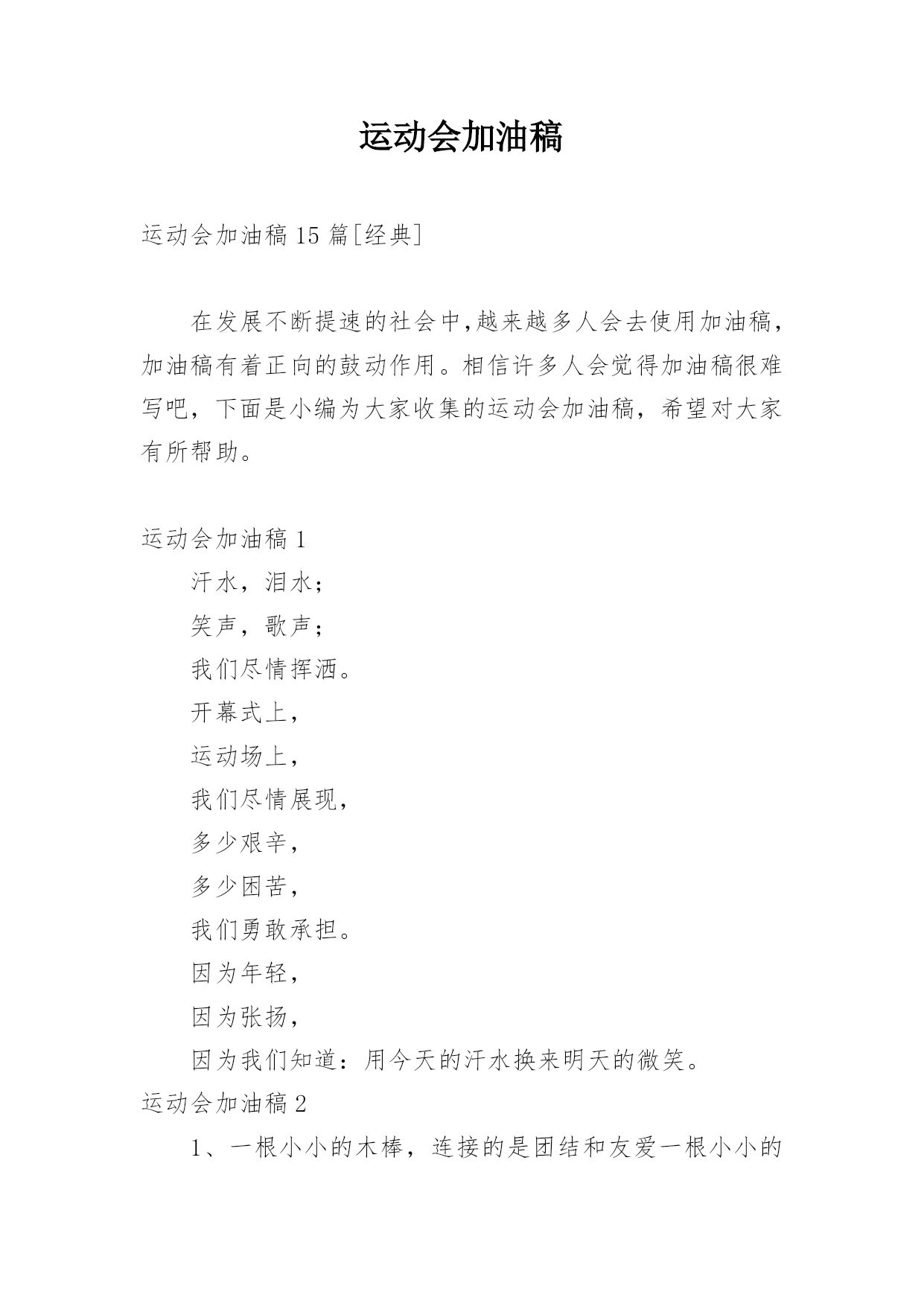 运动会加油稿运动会加油稿15篇[经典]在发展不断提速的社会中,越来越多人会去使用加油稿,加油稿有着正向的鼓动作用。相信许多人会觉得加油稿很难写吧,下面是小编为大家收集的运动会加油稿,希望对大家有所帮助。运动会加油稿1汗水,泪水;笑声,歌声;我们尽情挥洒。开幕式上,运动场上,我们尽情展现,多少艰辛,多少困苦,我们勇敢承担。因为年轻,因为张扬,因为我们知道:用今天的汗水换来明天的微笑。运动会加油稿21、一根小小的木棒,连接的是团结和友爱一根小小的木棒,传递的是勇气和力量一根小小的木棒,演绎的是奋斗和拼搏加油吧