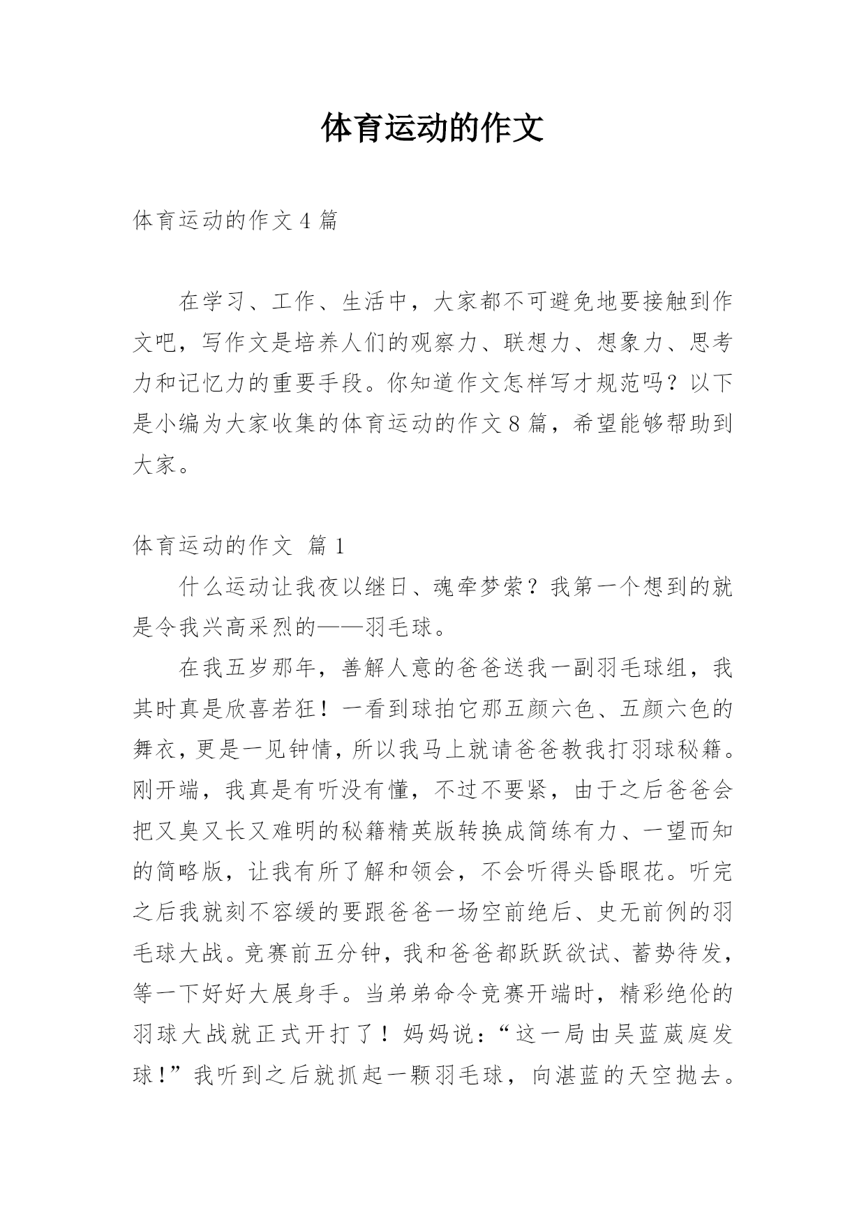 体育运动的作文体育运动的作文4篇在学习、工作、生活中,大家都不可避免地要接触到作文吧,写作文是培养人们的观察力、联想力、想象力、思考力和记忆力的重要手段。你知道作文怎样写才规范吗?以下是小编为大家收集的体育运动的作文8篇,希望能够帮助到大家。体育运动的作文篇1什么运动让我夜以继日、魂牵梦萦?我第一个想到的就是令我兴高采烈的——羽毛球。在我五岁那年,善解人意的爸爸送我一副羽毛球组,我其时真是欣喜若狂!一看到球拍它那五颜六色、五颜六色的舞衣,更是一见钟情,所以我马上就请爸爸教我打羽球秘籍。刚开端,我真是有听没